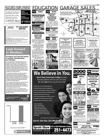 entry-level training for land and offshore oilrigs. Excellent wages, benefits and opportunities to travel the world. Sept 13th-Oct 2nd. Contact: 1-866-807-3960 www.mdslimited.ca FOODSAFE 1 DAY COURSES Guaranteed best value! Six Metro Vancouver Locations: Vancouver • Burnaby • Surrey • Richmond • Coquitlam • Maple Ridge All our Instructors are also working local Health Inspectors! Classes held each week & weekend! Course materials available in 6 languages. Same-day Certification. Visit our website at www.foodsafe-courses.com or call 604-272-7213 ADVANCE Hospitality Education – B.C.’s #1 Choice for Foodsafe & WorldHost Training.
