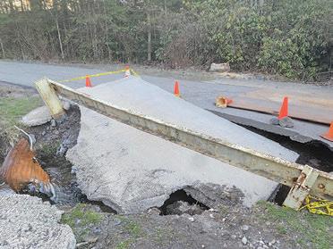The bridge on Ochre Mill Road in Packer Township over Blair Creek collapsed on March 12. At left, a concrete pillar shows the break, and to the right the steel plates that were installed to provide access are visible. Supervisors’ chairman Bob Selert said the iron pipe under road rusted out from the bottom. With the recent heavy rains, the fill washed out, leading to the collapse.