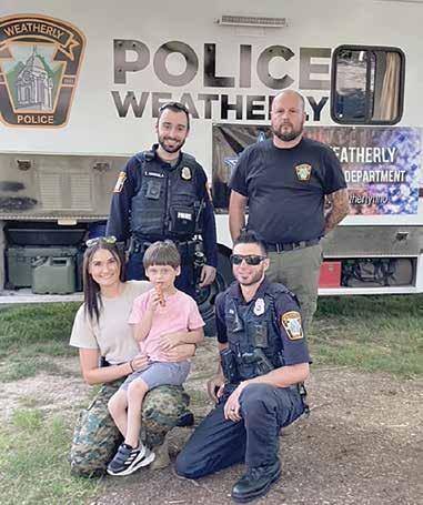 National Night Out in Weatherly on Tuesday, August 1, was a success. Members of the Weatherly Police Department, Carbon County Sheriff’s Department, State Forest Rangers, Citizens Fire Company #1 and ALA Unit 360 were represented at the event held at Eurana Park. Stopping by were State Representative Doyle Heffley and some staff members and District Attorney Michael Greek. There were games to play, free hot dogs from the Weatherly PD and pizza from Unit 360, and many free items. Fire trucks, police vehicles and tow trucks were on display. Smokey Bear was there for pictures. Over 60 children entered the drawing to win a backpack filled with school supplies donated by Unit 360. The backpack was won by Lilly Miletto. Above, members of the Weatherly PD with a young fan, Jax DeFelice. More photos, page 8. Contributed photo