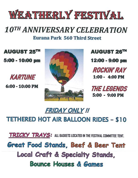 The 10th annual Weatherly Festival will be held at Eurana Park on Friday, August 25 from 5-10 p.m. and on Saturday, August 26, from noon-9 p.m.