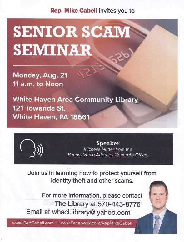 If you want to learn more about scams and scammers, consider attending the Scam Seminar on Monday, August 21, from 11 a.m. to noon at the White Haven Area Community Library. Protect yourself, so you can continue to help others.