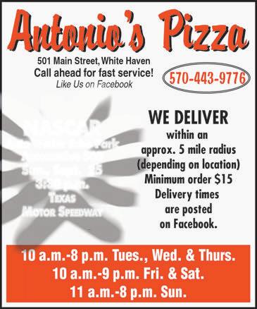 This Sunday September 25 1 p.m. CLAY BIRD & BLOCK SHOOT Great Food & Prizes For 2022–Turkeys will be drawn The Big Wheel will be spinning! L.O.W.L.P.A. Inc. Grounds Tunnel Road, Dennison Twp For info call Jim at 570-401-8161 Dues are due by the Block Shoot! House Gun Only, will be provided for Block Shoot. Claybird Shooters: Please try to bring your own shells. Shells for purchase are limited. Weatherly Country Inn Restaurant & Catering 570-427-8550 Dine-In or Take-Out Tuesday through Saturday, 4 - 8 p.m. Funeral Luncheons | Parties by Reservation Leave the prep and serving to us Located 6 Miles from White Haven, 1 Mile from County Home in Weatherly on Lehigh Gorge Drive (Weatherly-White Haven Highway) www.weatherlycountryinn.com 416MainStreet,WhiteHaven 570-443-7000 Take-Out orDelivery www.JirehsPizzeria.com Jireh’s Pizzeria&Restaurant Jireh’s Pizzeria&Restaurant Open11a.m.Mon.-Sat.,ClosedSun.
