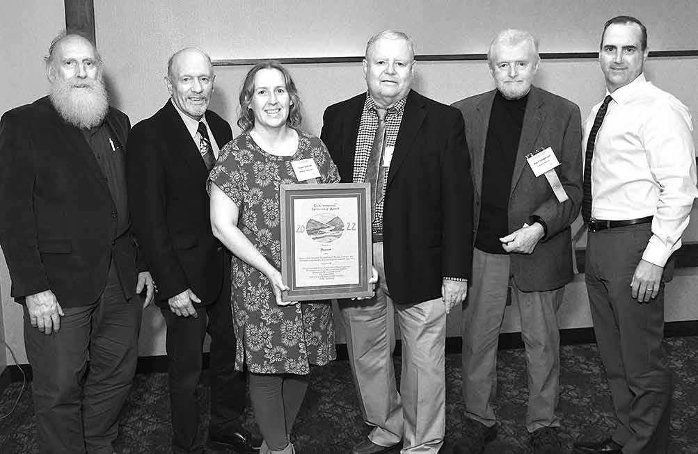 The 32nd annual Pennsylvania Environmental Council Awards Banquet was held November 3 at the Woodlands in Wilkes-Barre. The award was given to the Wildlands Conservancy on behalf of all the partners involved with the acquisition of the 2,700 acre Penrose Swamp Barrens near Weatherly. Members of the partnership award in the photo are, from left, Don Miller, Pocono naturalist and former president of Pocono Heritage Land Trust; Don Baylor, past president of Brodhead Trout Unlimited and aquatic resource consultant; Dr. Dawn Gorham, Wildlands Conservancy biololgist; Mike Gondell, Penrose project coordinator; Ray Youngblood, founding member/past president of Western Pocono Trout Unlimited and botancial authority; and Chris Kocher, Wildlands Conservancy Director. Absent when photo was taken were assistant District Forester Karl Myhre, District Forester Tim Ladner, University of Pennsylvania and Morris Arboretum Professor Emeritus Dr. Tim Block, University of Pennsylvania and Morris Arboretum botanist Dr. Ann Rhoads, and former University of Pennsylvania and Morris Arboretum botanist Dr. Roger Latham. The Pasco Schiavo family and estate, as original owners of the property, were also involved in the acquisition and transfer. The new acquisition is currently owned and managed by the Pennsylvania Bureau of Forestry, Weiser District Forest and is open to the public for traditional recreation like hunting, fishing, foraging, hiking, cross country skiing, birding, photography and further research projects.