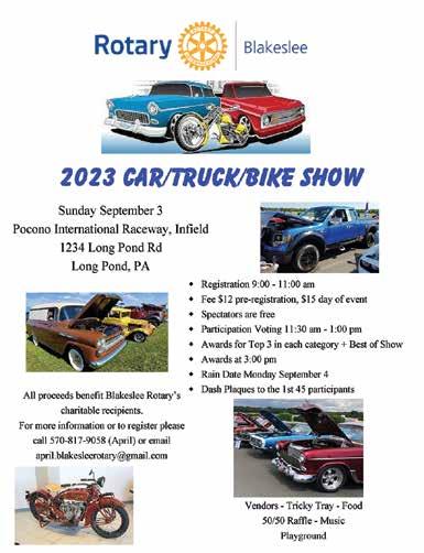 The annual Blakeslee Rotary Car Show returns to Pocono Raceway on September 3. In case of rain, the event will be moved to September 4. This year’s show promises to be even bigger and better, featuring more vendors, food trucks, spacious show vehicle parking areas, and a lively DJ. Don’t miss out on the chance to participate in tricky trays, and bring your kids along to enjoy the world-class playground on site.