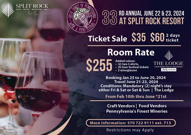48 — Lake News, March-April 2024 Presorted Standard U.S. Postage PAID Permit #18 White Haven PA 18661 BOXHOLDER 244 Lake Harmony Road, Lake Harmony, PA 18624 570-722-3990 Sun., Weds., Thurs. 4-9 pm | Fri. & Sat., 4-10 pm Closed Monday & Tuesday All Major Credit Cards Accepted 286 Lake Harmony Road, Lake Harmony, 18624 Eventually Everyone Shows Up At Serving the Best Sunsets! www.louiesprime.com Find us on Facebook for updated information Open 6 Days a Week for Dinner (closed Tuesdays) Lunch Thursday-Sunday | Breakfast Sunday 8:00-11:45 am Women & Wine April 10 & mAy 8 reservAtions required 20 S. Lake Drive, Lake Harmony 570-722-2500 www.nickslakehouse.com FOR INFO & DIRECTIONS: 570-722-1100 www.shenaniganslh.com SHENANIGANS FOOD • FUN • SPORTS Traditional New York Style Steakhouse Fine Dining | Casual atmosphere Penn-Kidder Dimmick Library’s Kentucky Derby Party Sat., May 4, 3:30 pm POCONOS #1 DANCE CLUB Boomers Karaoke 9-1 am Friday & Saturday Open 6 days a week for dinner, 4 pm Closed Wednesdays Lunch Saturday & Sunday All sports on I4 TVs Mother’s Day, 2–8pm Mother’s Day Specials and Regular Menu Mother’s Day Sunday, May 12 12-8 Mothers Day Brunch Buffet 10:00am4:00pm Reservations Required. $38 Adults/ $19 Kids 10 years and younger (under 4 Free) 25th Anniversary May 16 Customer Aprreciation 6-9 Fuzzy Park Band WINE WARS Dinner – Fri., May 3 Reservations required