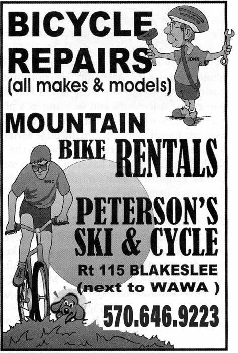 Another way to enjoy the season is to drive along beautiful, forested roads to Peterson’s Ski and Cycle in Blakeslee. Now is an excellent time to get ready for ski season or purchase a mountain bike so you can enjoy cycling through the autumnal beauty of our area. You can also get jackets, blankets, souvenirs and so much more. Stop by or visit us online at www.petersonsskiandcycle.com. We hope to ski you soon!