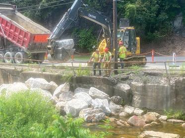 TEMPORARY FIX? A crew was out Tuesday morning depositing boulders in the Black Creek behind the worst of the areas that have caved in along Hudsondale Street in Weatherly. Doubts about whether PennDOT’s planned repair project could wait until next spring if this year’s hurricane season is bad were expressed at the June borough council meeting. At right is one of the six utility poles that will need to be moved. Borough manager Harold Pudliner said a plan has been developed to move the lines, and easements have been obtained from affected property owners, but the borough must work through PennDOT’s online system, a process that is underway.