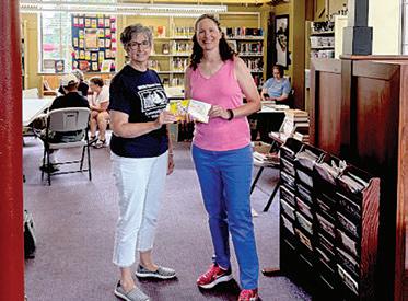 CD DONATION: Nina Peterson, right, performed children’s songs at the library, and donated two of her CDs to library board president Diane Lamson; they will be available for borrowing.