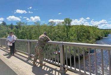 Top, laying a wreath at the White Haven Honor Roll. Above, a wreath goes into the Lehigh River for those lost at sea. At right, honor guard at the river.