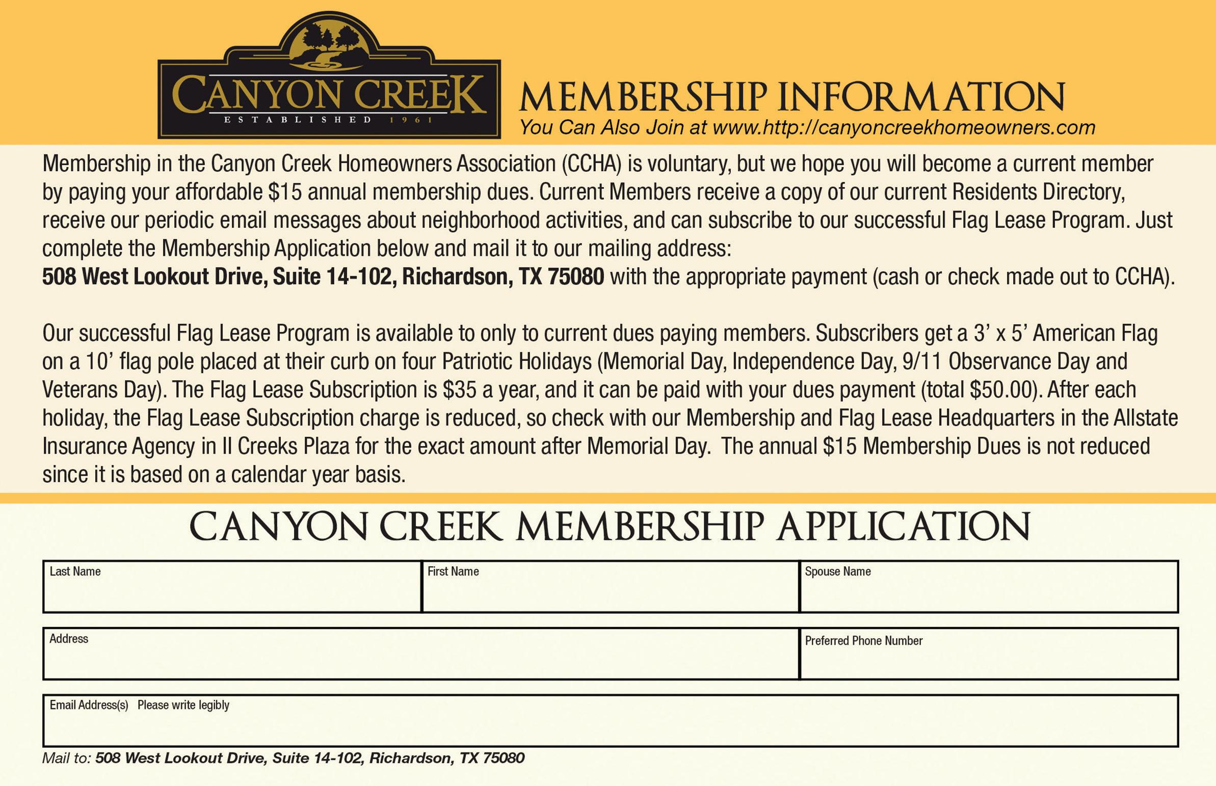 Gabe Meadows CCHOA Beautification DirectorOur successful Flag Lease Program is available only to current dues-paying members. Subscribers get a 3’ x 5’ American Flag on a 10’ flag pole placed at their curb on four Patriotic Holidays (Memorial Day, Independence Day, 9/11 Observance Day and Veterans Day). The Flag Lease Subscription is $35 a year, and it can be paid with your dues payment (total $50.00). After each holiday, the Flag Lease Subscription charge is reduced, so check with our Membership and Flag Lease Headquarters in the Canyon Creek Postal Company at 508 West Lookout Drive for the exact amount after Memorial Day. The annual $15 Membership Dues is not reduced since it is based on a calendar year basis but must be paid to subscribe to a Flag Lease.