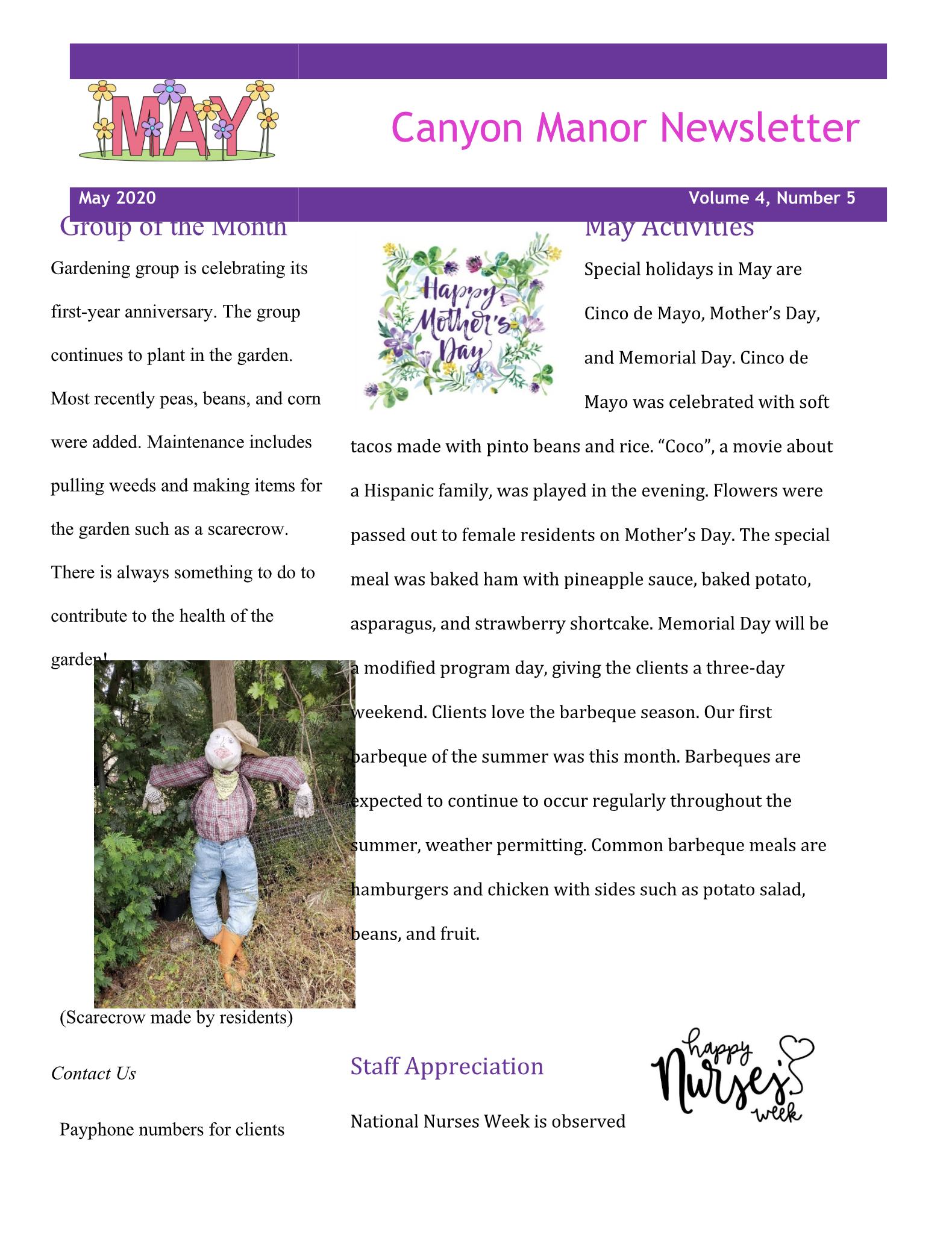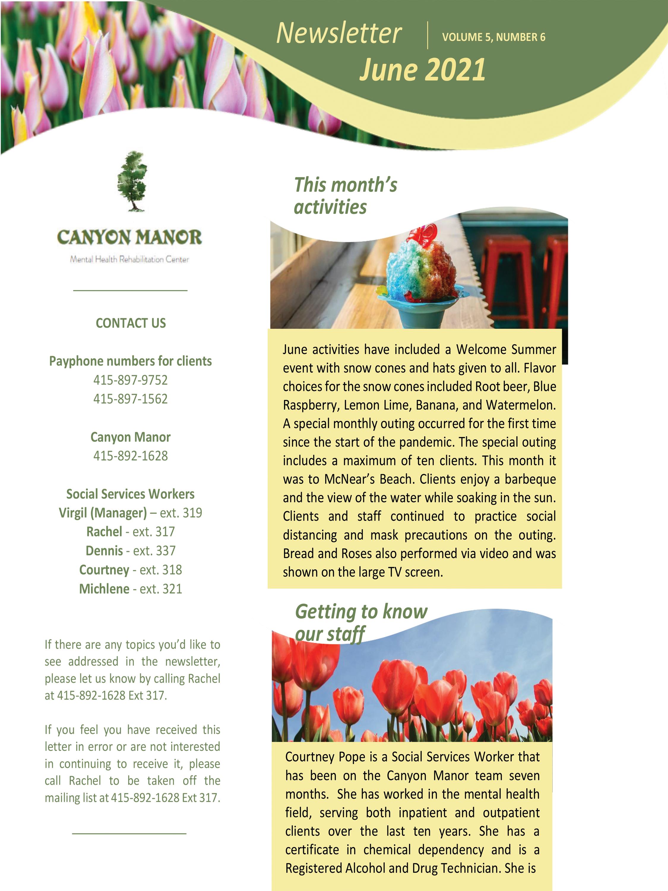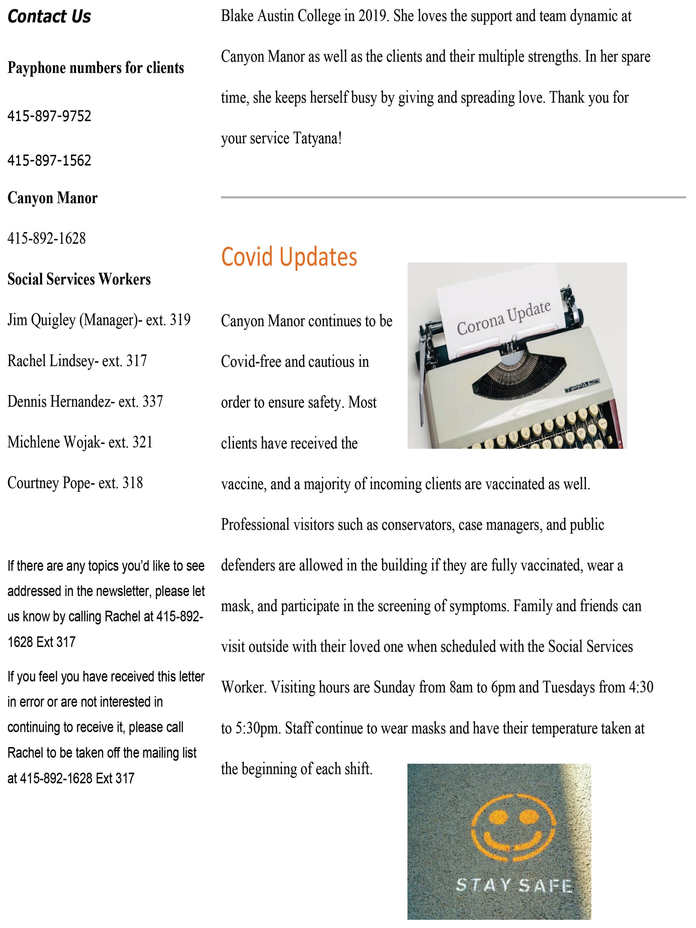 In an effort to keep family, conservators and case managers informed, a newsletter is being developed that will have what is currently happening at Canyon Manor! It will be sent out monthly with new information and general information about Canyon Manor to help keep everyone up to date.