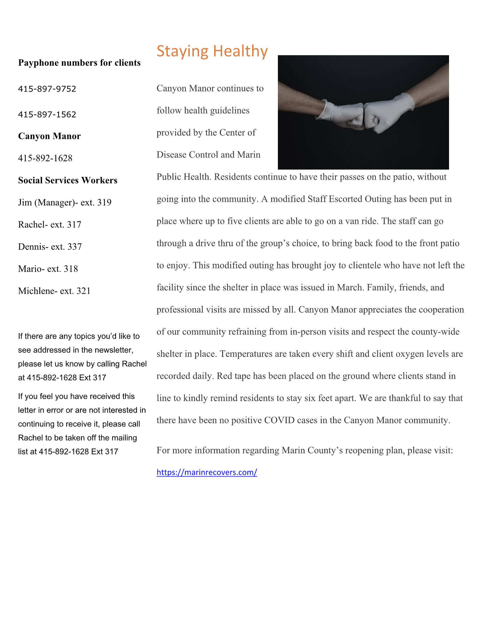 There is a trip to the beach this month. Those who stay at the facility will enjoy a movie and snacks. Contact Us Payphone numbers for clients 415 897 9752 415 897 1562 Canyon Manor 415-892-1628