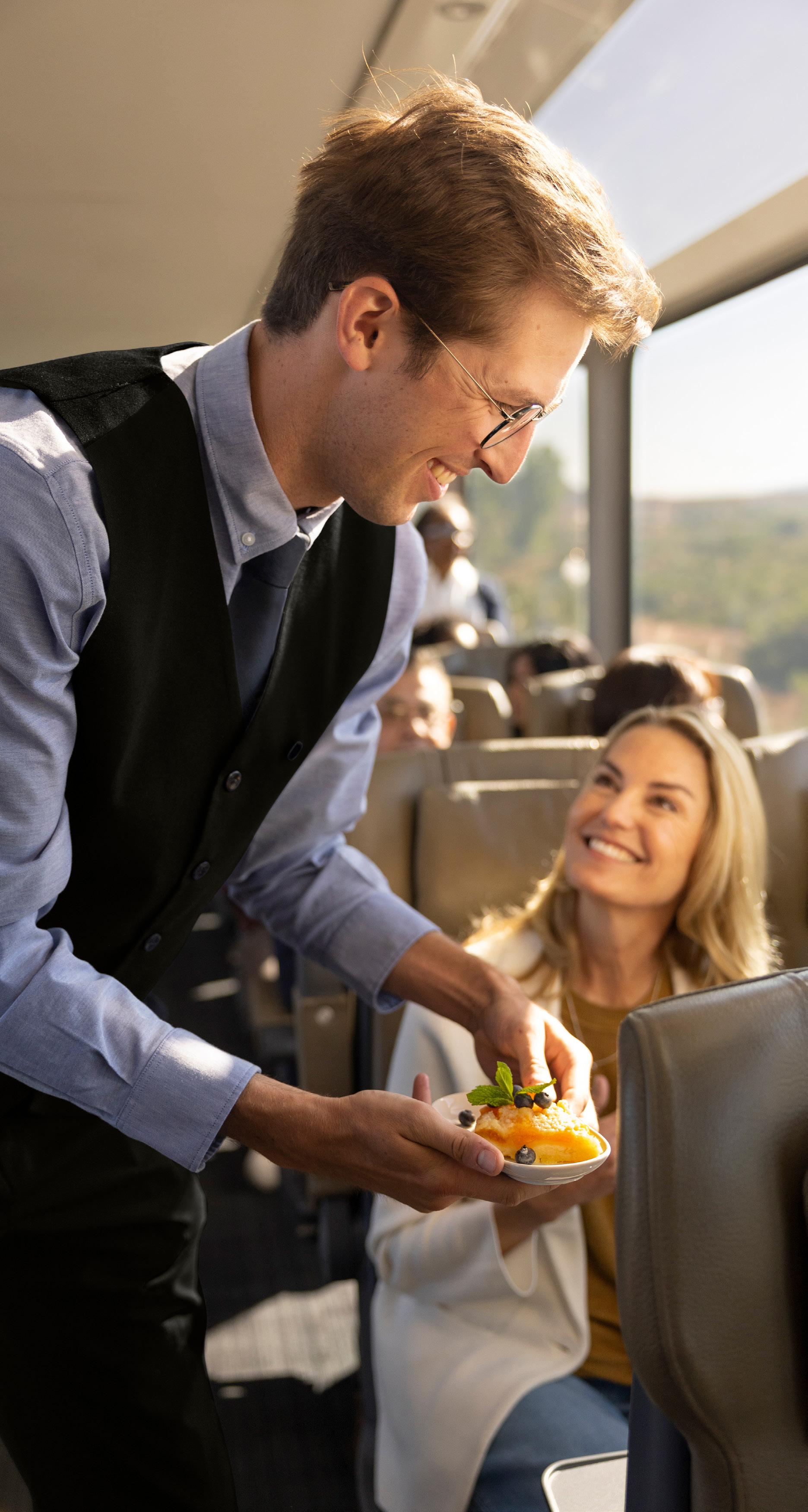 journey, regionally inspired meals, thoughtfully served right at your seat, paired with a curated selection of alcoholic and non-alcoholic beverages, are all included to make your experience seamless and indulgent. From the moment you board, every detail is crafted to ensure your journey is as unforgettable as the landscapes you travel through.