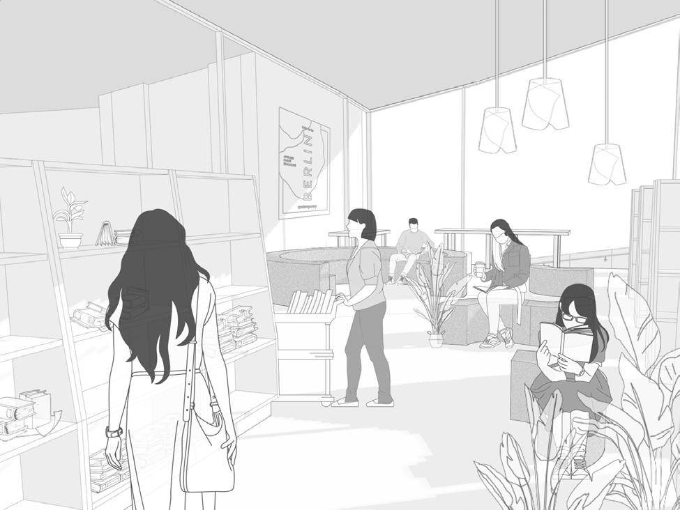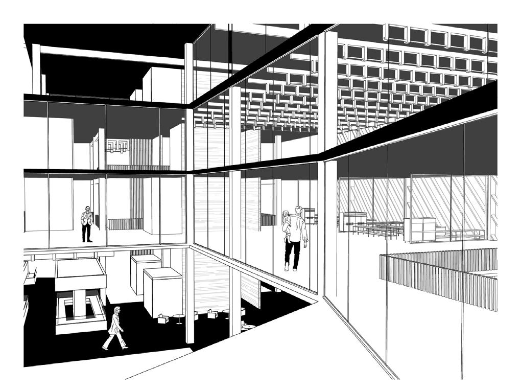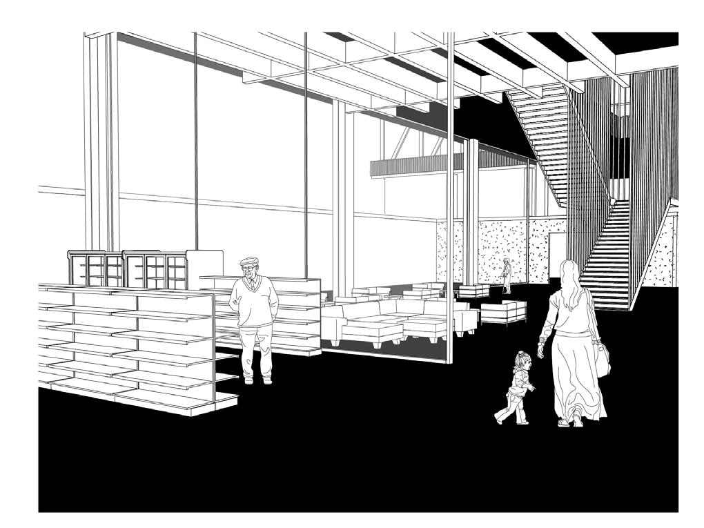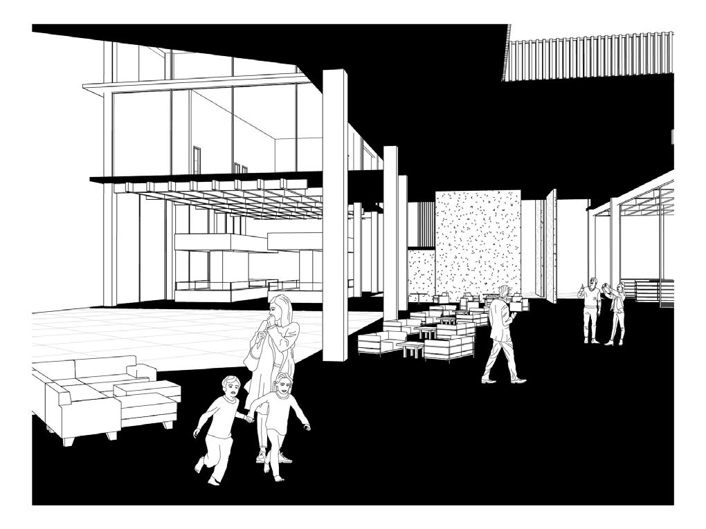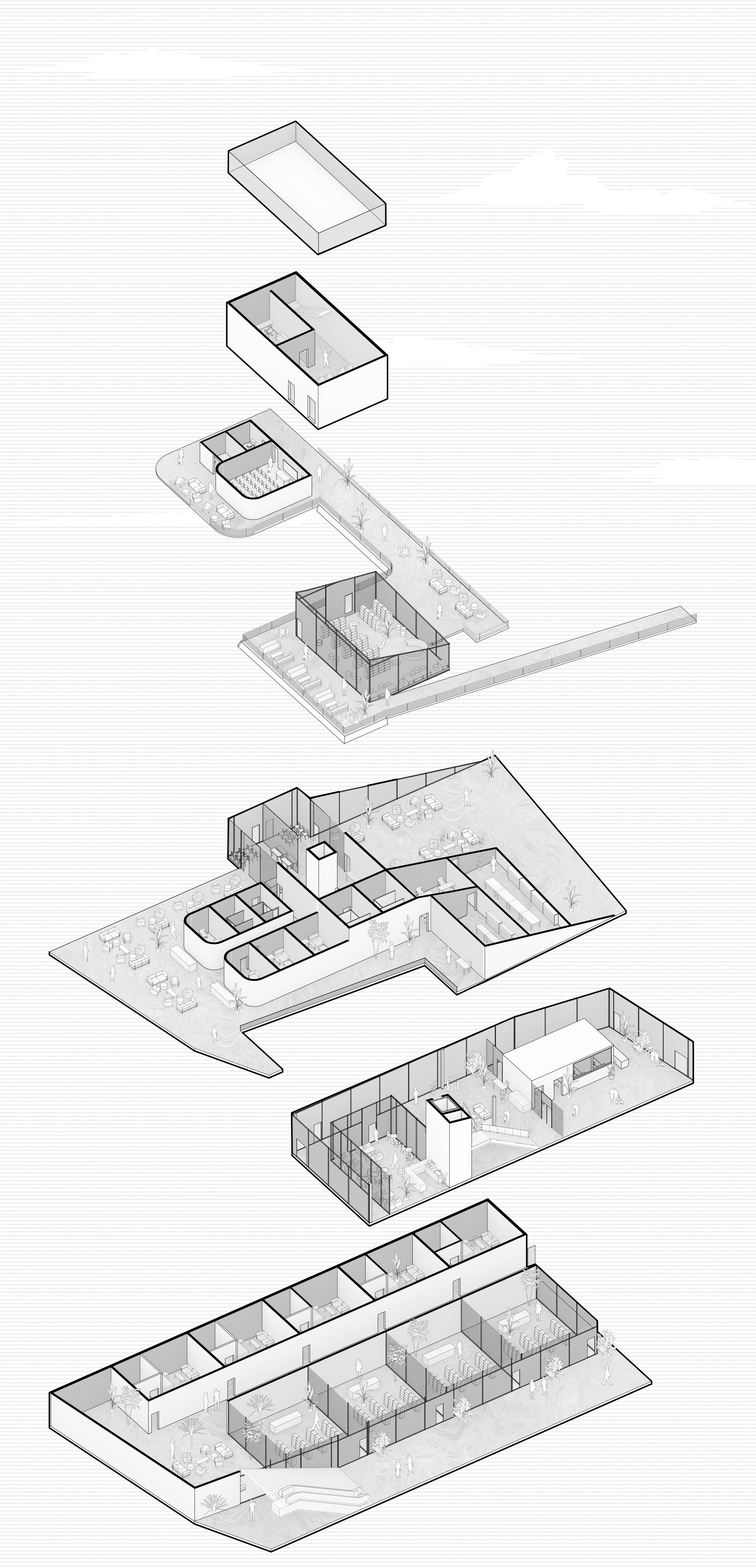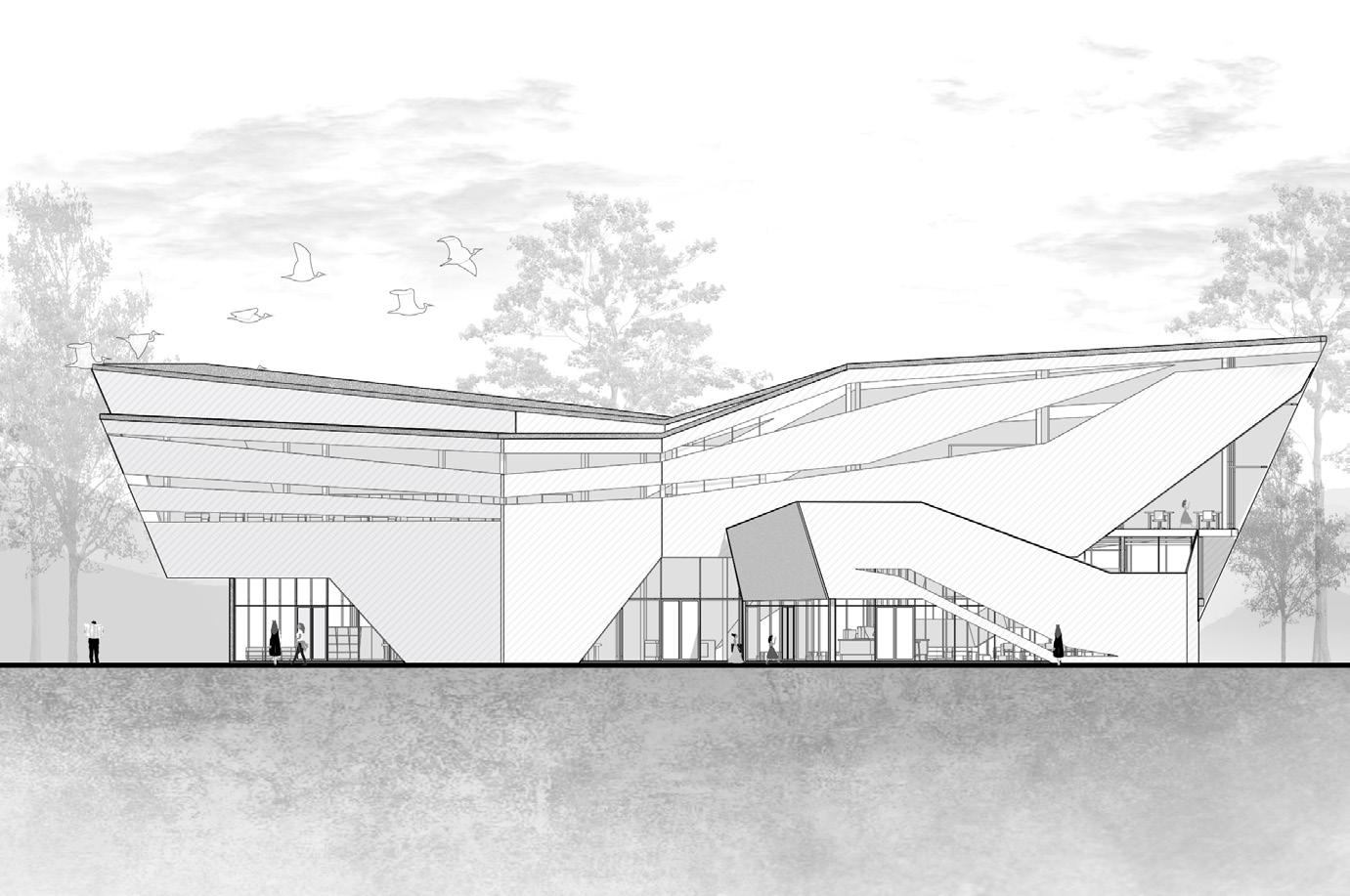Interior View of First Level Coffee Shop Interior View from First Level Lobby Second Floor Plan Exterior View from Outside Ramp Interior View from First Level Recreation Area Interior View of First Level Public Space Interior View of Second Level Library FLOOR PLAN / SITE CONTENTS INTERIOR VIEWS 5 4 3 2 1 6 7 8 9 12 13 14 16 17 18 15 10 11 1 - Border Control Room 2 - Waiting Area 3- Muti-Purpose Room 4- Library 5- Ramp 6- Outdoor Space 7- Public Space 8- Visa Checkpoint 9- Lobby 10- Consulting Room 11- Staff Oiffce 12 - Information Desk 13- Lobby 14 - Storage 15 - Security Room 16- Maker Space 17- Car Visa Check 18- Open to Below 19- Information Desk 20- Visa Checkpoint 21- Visa Checkpoint 22- Coffee Shop 23- Lobby 24- Staff Oiffce 25- Staff Catering 26- Staff Lounge 21 22 19 20 24 25 26 23 0 20’ 40’ N