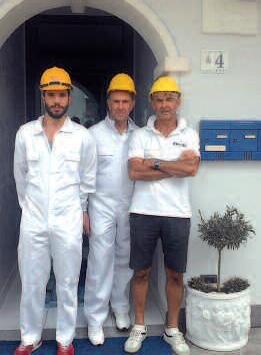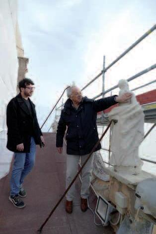 Da sinistra: Fessurazioni delle finestre e serramenti della facciata sud Crepe strutturali della facciata frontale. Giovanni e Tommaso Padovese illustrano il restauro delle statue marmoree del timpano. La prova colore dell’intonaco. Membri del Comitato in visita al cantiere.