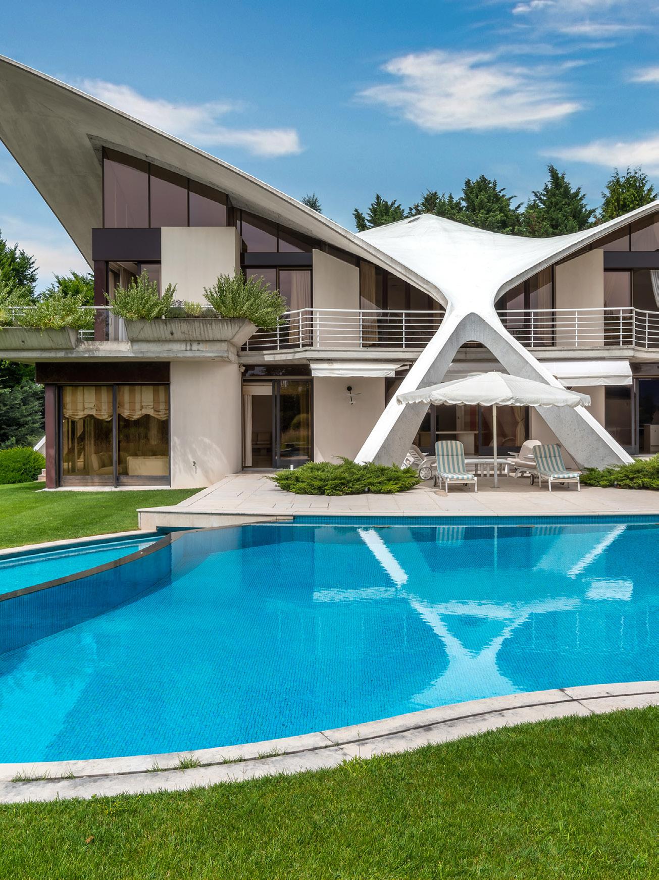 This sumptuous, architecturally unique villa in the popular, tax-advantaged commune of Cologny was designed by architect Marendaz in 1985 and renovated in 2005 and 2007.