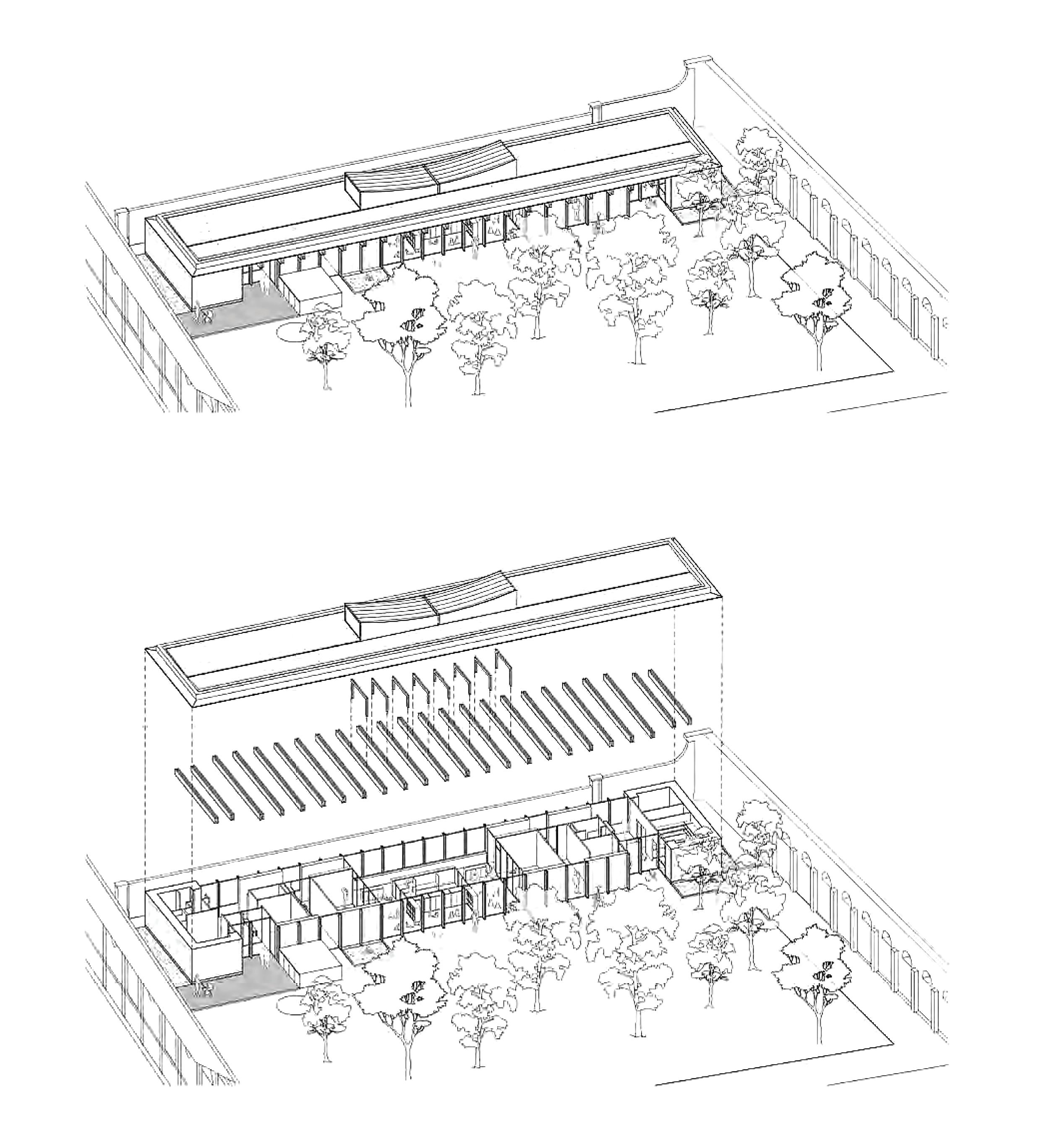 peatonal, de adoquines reutilizados, que se expande para convertirse en la explanada del edificio. El posicionamiento de la habitación de madera para dejar los cochecitos de los niños, invita a dirigirse con naturalidad hacia la esquina noreste del edificio. Una vez colocados los mismos en la habitación baja, los visitantes entran a la guardería a través de una esclusa de aire que se abre a un pasillo en cruz. Por un lado, la oficina del director da la bienvenida al público y vigila la entrada, y por el otro, se habilita un espacio para la atención de los padres.