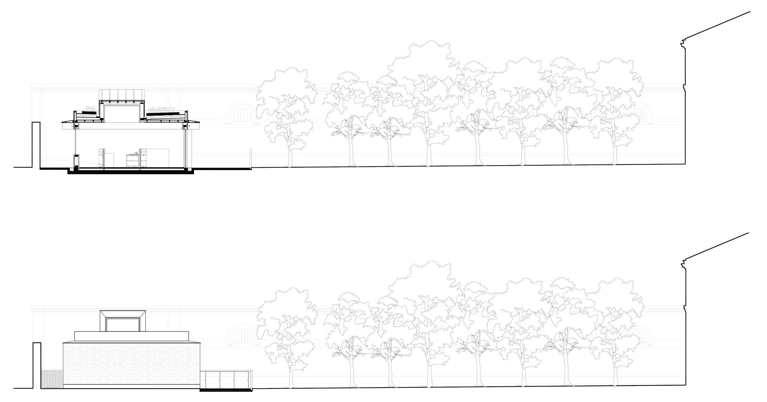 La torre Eiffel, el Museo Quai Branly, la intensa materialidad parisina, el movimiento, la profundidad histórica de un paisaje fuerte y un territorio singular... Es en un contexto monumental y poderoso, retirado y alejado del tumulto urbano, donde la Presidencia de la República decidió programar la construcción de una guardería. Previamente alojada en un edificio antiguo e inadecuado de la rue de l’Elysée, su nueva localización ofrece un lugar verdaderamente sereno. En el corazón del Palais de l’Alma, antiguos establos de Napoleón, el jardín sur permite que el silencio resuene para dar la bienvenida al nuevo equipamiento. Los monumentos de los alrededores, tan diferentes en su composición, nos cuentan diariamente la historia de París. Uno de los desafíos del proyecto es registrar con precisión este tejido urbano excepcional para respetar al máximo el patrimonio existente, pero también para ampliar las cualidades de un lugar tranquilo dominado por la vegetación y revelar el espesor del entorno. Dentro del Palais de l’Alma, el eje central y la composición racional de volúmenes construidos nos permiten sumergirnos en una arquitectura simétrica; sólo el jardín aparece como un pulmón verde, bucólico, en medio de un conjunto construido. Delimitado al sur y al oeste por dos muros circundantes, el sitio del proyecto prolonga sutilmente el jardín sur del Museo Quai Branly, diseñado por Gilles Clément: ambos conforman un espacio vegetal coherente. Esta importante relación urbana, así como nuestro deseo de trabajar en conjunto con el ala de la Maréchalerie, han guiado nuestra concepción por la implementación de un único volumen longitudinal al sur del terreno. Limitado por la zona boscosa del jardín y una banda de 15 metros al sur y al oeste, esta disposición nos permite restaurar un frente construido al sur del jardín (como fue el caso, en el pasado, con la construcción de edificio de la Meteorología Nacional), en un todo cuestionando la naturaleza del muro recinto. Este último se convierte en el soporte del proyecto, un grueso muro que vive y que se abre hacia el jardín. A modo de pabellón, una conexión profunda se teje entre el interior y el exterior. El volumen construido de la guardería y su espacio exterior se extiende desde el muro recinto al paseo. Para anclar el edificio en el sitio, se deja un espacio al sur entre la pared del jardín y la guardería para permitir el acceso necesario para la seguridad. El lugar es sensible por su destino y su función, y no ofrece visión directa desde el espacio público: se implementa la noción de corte y de espacio introvertido. Al norte, el jardín infantil se encuentra directamente con el Palacio para disfrutar de un escape visual a la naturaleza. Frente a una relación íntima con la naturaleza y una búsqueda