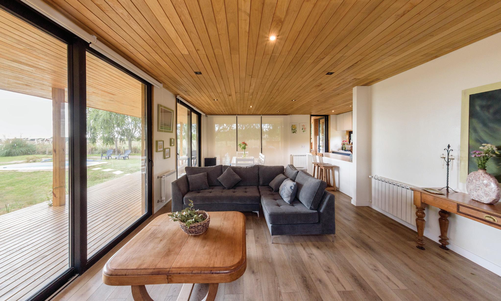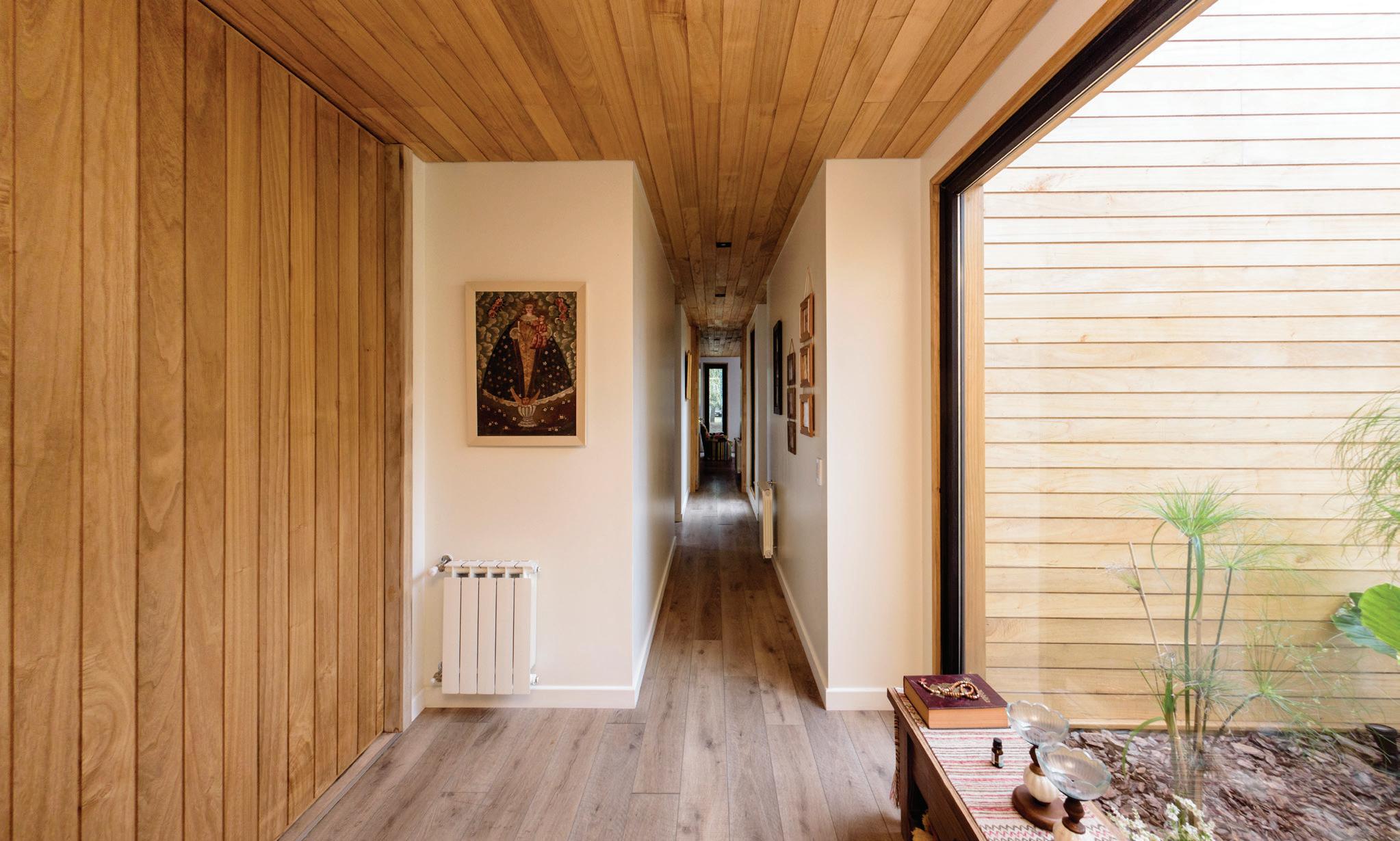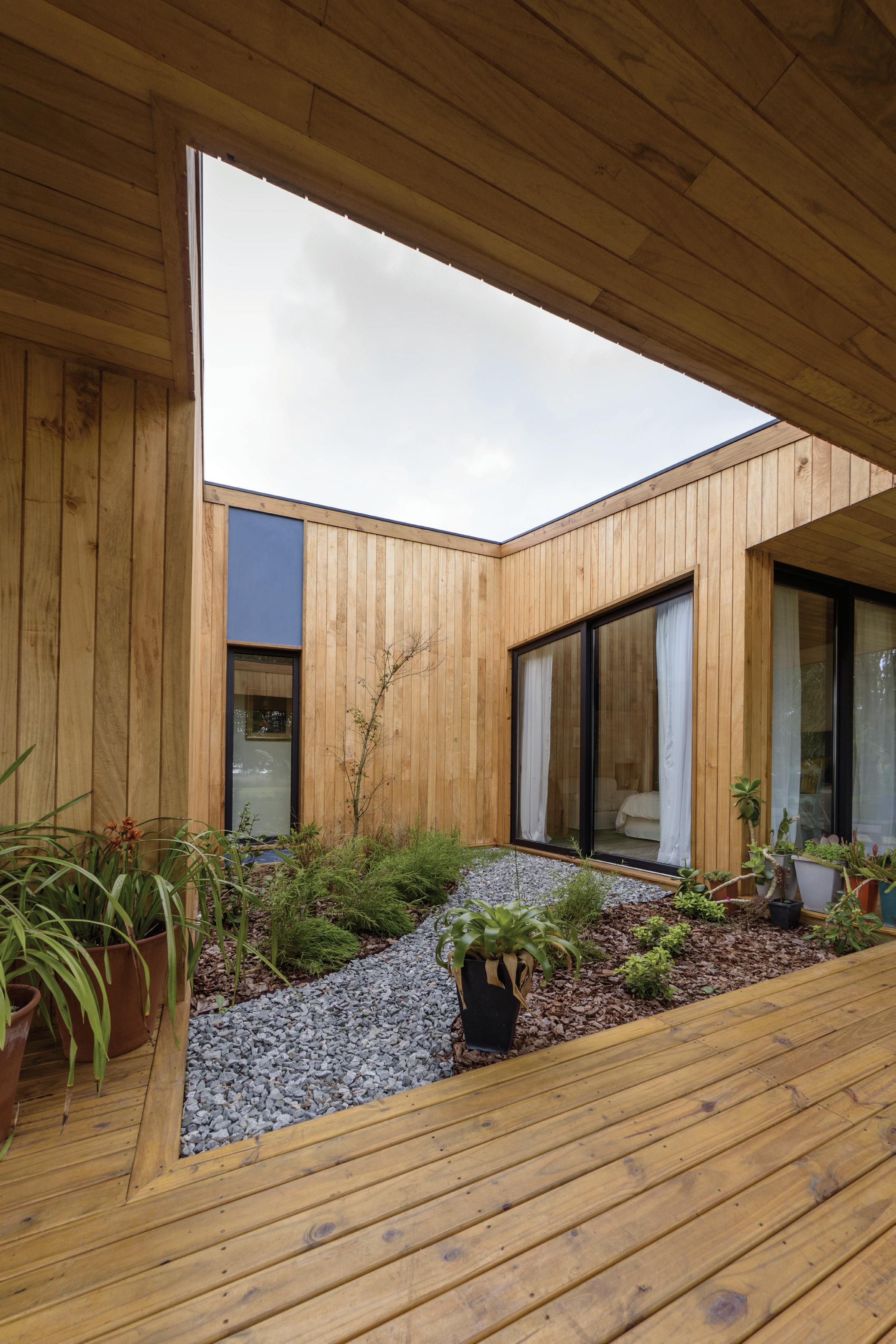 neal, paralelo a la laguna, y se compone de dos alas divididas por un núcleo central, el hall de acceso. El ala este contiene el sector público mientras que el ala oeste el privado. Nuestra premisa fue desarrollar el proyecto acentuando la transición entre el entorno y la casa; de esta manera, a lo largo de todo su recorrido se extiende, entre la laguna y el espacio interior, una galería de lado a lado, que en su trayecto encuentra dos jardines interiores que, además de dar privacidad entre los distintos ambientes, intentan replicar en escala la belleza del entorno. Un jardín, un haz de luz, un ecosistema. La idea de la separación de espacios a través de jardines internos hace posible, de forma fugaz y primordial, la relación exterior-interior. La naturaleza se adapta al espacio, se fusiona con la obra. Vivir el paisaje. La naturaleza se adentra en la arquitectura, el paisaje atraviesa el proyecto. El acceso a la chacra se planteó atravesando el bosque nativo y la cortina de sauces, un sendero adaptado al entorno que encuentra su fin perpendicular a la implantación de la vivienda, que espaldada en el bosque esconde el paisaje primero, para entregarlo después a través de un ventanal en el hall de acceso que abre el espacio hacia la laguna en una visual ininterrumpida. En concordancia con la premisa de proyectar en una actitud sensible con el entorno, optamos por la madera como el material indicado para la materialización de la casa. Tanto en su fundación, su elevación, cubierta y revestimientos, la casa se realizó íntegramente en madera, motivados por su nobleza como elemento natural, su amabilidad con el entorno debido
