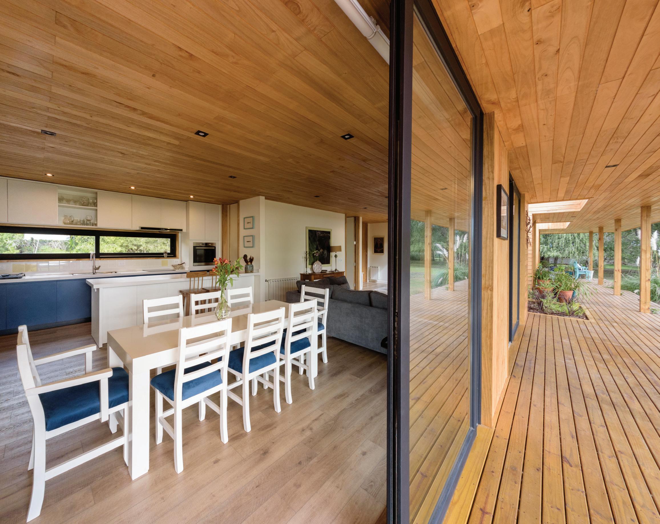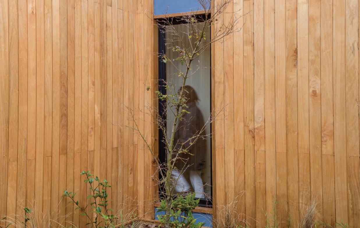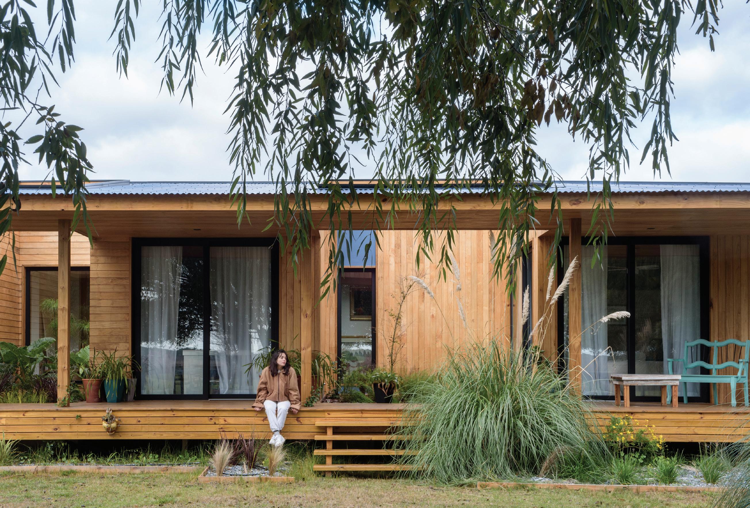 neal, paralelo a la laguna, y se compone de dos alas divididas por un núcleo central, el hall de acceso. El ala este contiene el sector público mientras que el ala oeste el privado. Nuestra premisa fue desarrollar el proyecto acentuando la transición entre el entorno y la casa; de esta manera, a lo largo de todo su recorrido se extiende, entre la laguna y el espacio interior, una galería de lado a lado, que en su trayecto encuentra dos jardines interiores que, además de dar privacidad entre los distintos ambientes, intentan replicar en escala la belleza del entorno. Un jardín, un haz de luz, un ecosistema. La idea de la separación de espacios a través de jardines internos hace posible, de forma fugaz y primordial, la relación exterior-interior. La naturaleza se adapta al espacio, se fusiona con la obra. Vivir el paisaje. La naturaleza se adentra en la arquitectura, el paisaje atraviesa el proyecto. El acceso a la chacra se planteó atravesando el bosque nativo y la cortina de sauces, un sendero adaptado al entorno que encuentra su fin perpendicular a la implantación de la vivienda, que espaldada en el bosque esconde el paisaje primero, para entregarlo después a través de un ventanal en el hall de acceso que abre el espacio hacia la laguna en una visual ininterrumpida. En concordancia con la premisa de proyectar en una actitud sensible con el entorno, optamos por la madera como el material indicado para la materialización de la casa. Tanto en su fundación, su elevación, cubierta y revestimientos, la casa se realizó íntegramente en madera, motivados por su nobleza como elemento natural, su amabilidad con el entorno debido