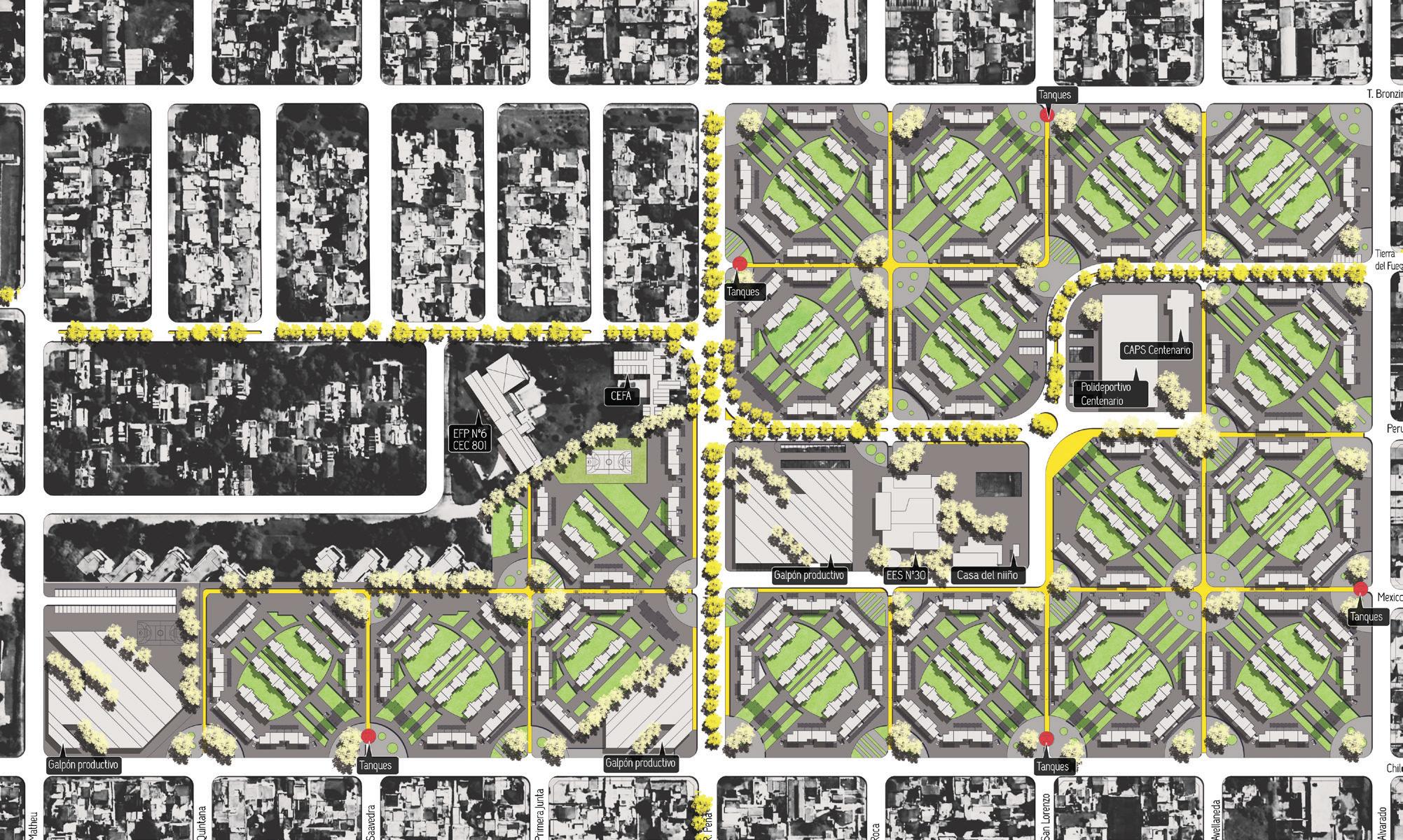 conjunto, son las premisas respecto de evitar la segregación física. Si bien la estructura de supermanzanas se mantiene, la red viaria interna se jerarquiza a partir de una articulación de dos bulevares arbolados, uno que da continuidad a la calle Tierra del Fuego en dirección NO-SE, y otro en la calle Peña, que también articula el barrio Centenario con otros conjuntos de vivienda adyacentes. Esta red principal se transforma también, se cualifica como una referencia necesaria que se contrapone a la uniformidad y monotonía actual que impone la estricta geometría del barrio.