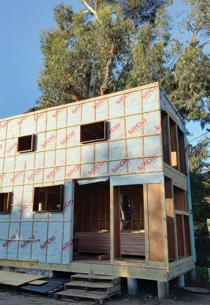 de piedra, de 35 centímetros de ancho. Se realizaron anclajes químicos para vincular la solera de nivelación con la fundación y la estructura de la casa. El sistema constructivo de la caja arquitectónica se realizó 100% en madera de pino tratada en autoclave; la producción de los bastidores, vigas y costillas para la pared sur (fardos) se realizó de manera prefabricada en taller de acuerdo al modelado del proyecto. En cuanto al diseño, fue muy importante la etapa de planificación, cálculo y modelización, con el fin de estudiar las alternativas para la toma de decisiones más eficientes en cuanto a recursos y etapas y de esta manera disminuir los tiempos de obra. El tiempo de fabricación en taller fue de 4 semanas, incluida una prueba de armado 1:1 para verificar los últimos detalles. Se utilizó, en tres de las caras, el sistema de trama de madera Platform Frame, de 2”x4” y con 100 mm de aislación; en la cara sur, se utilizó un sistema de estructura de costillas con aislante de fardos de rastrojo de trigo, con un ancho de muro de aproximadamente 50 centímetros.