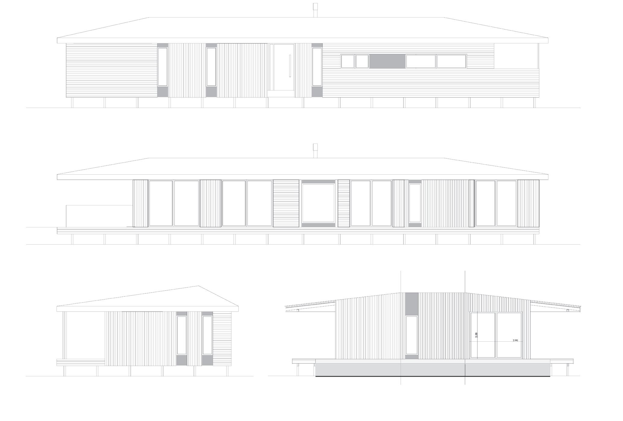 El revestimiento exterior es de madera eucalipto grandis 1”x5”, sin pintura adicional, lo que provocará el cambio de color en el tiempo, mimetizándose con los árboles circundantes. Las aberturas son de PVC de abrir (mayor eficiencia) con DVH 4+9+4, y en algunos sectores, paños fijos de madera con el