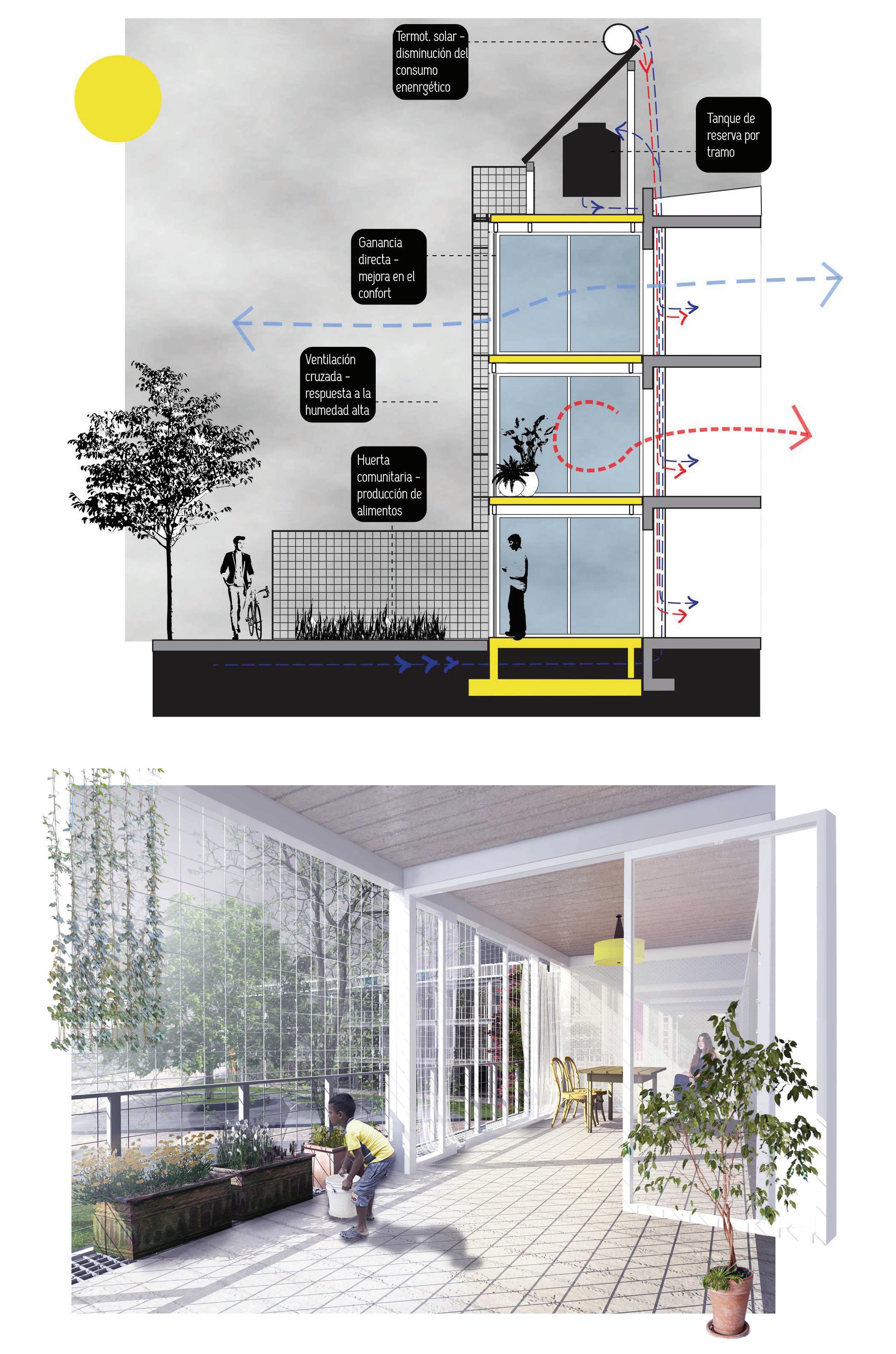 =Favorecer la ventilación de las unidades de vivienda, proveyéndoles de espacios filtro (MAS) que reduzcan la radiación solar sobre los edificios.