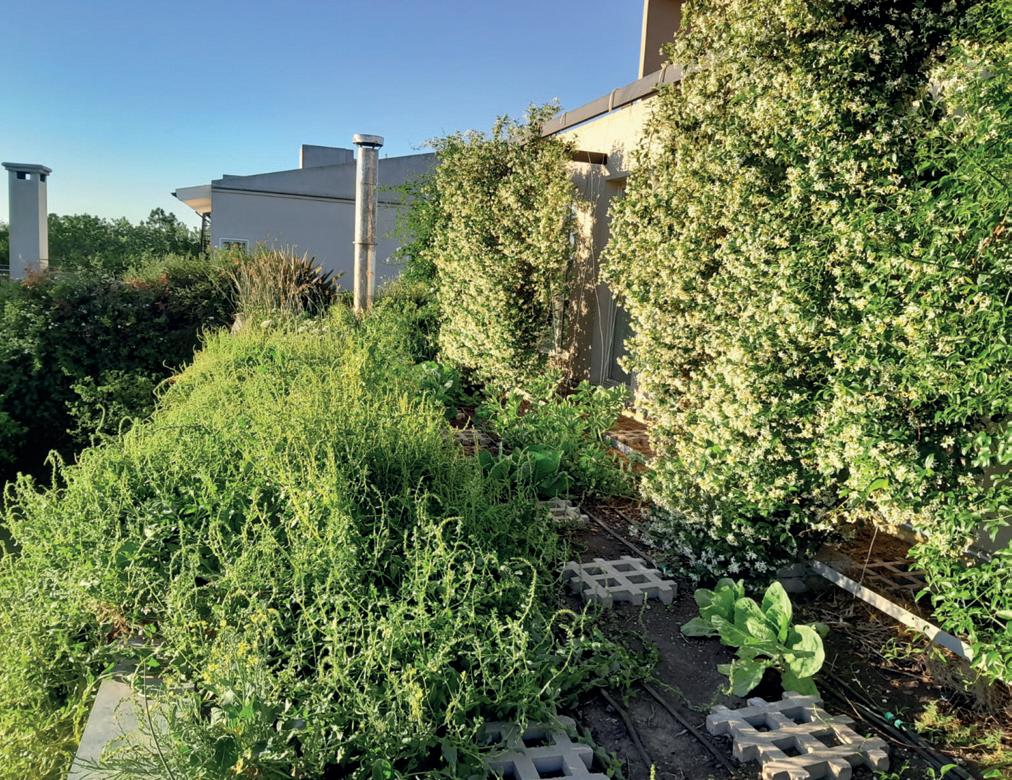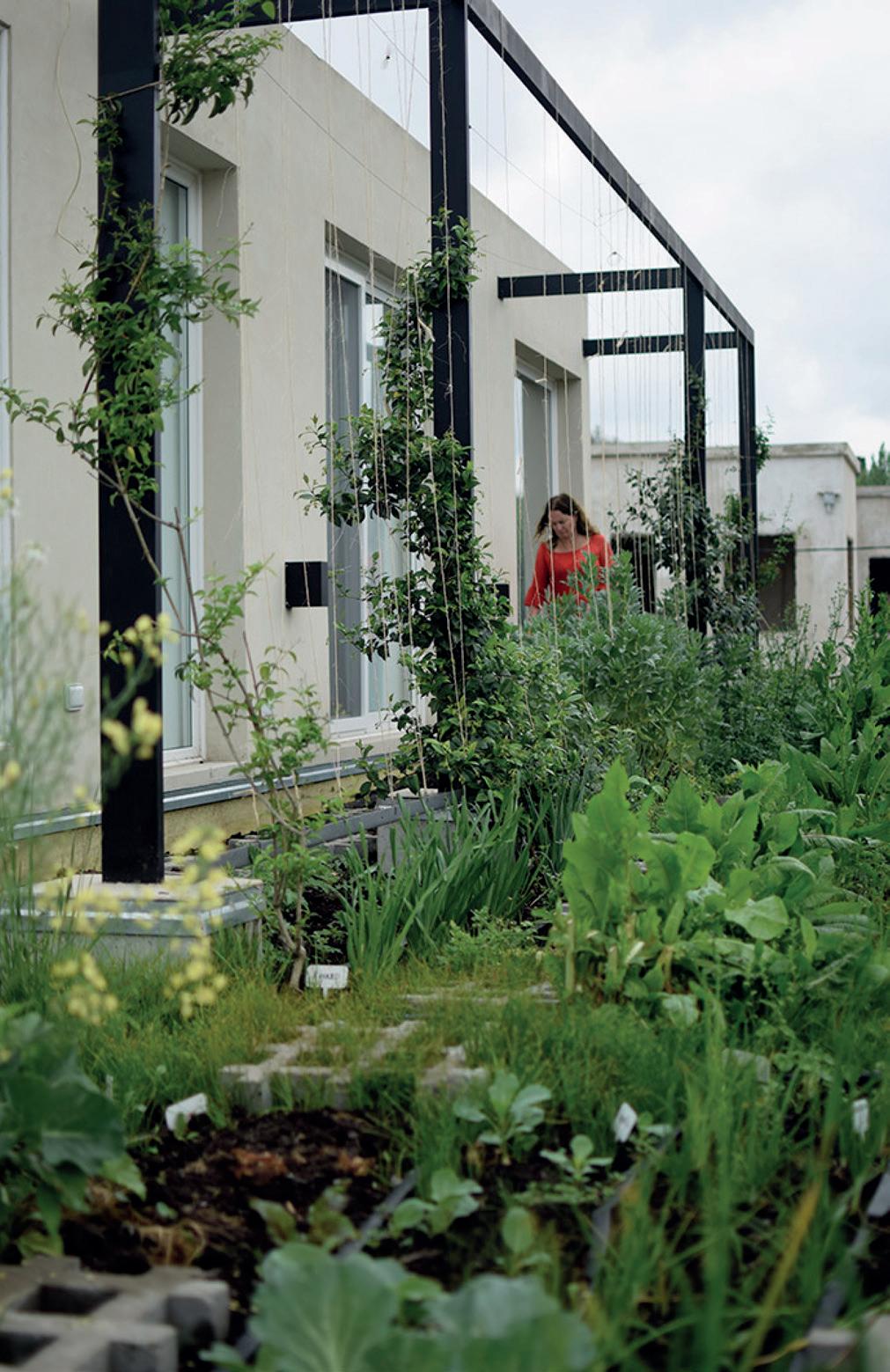 Se diseñó un área de producción de alimentos separada en planta baja (frutales) y terraza verde (huerta) en planta alta, suficiente para el consumo familiar.
