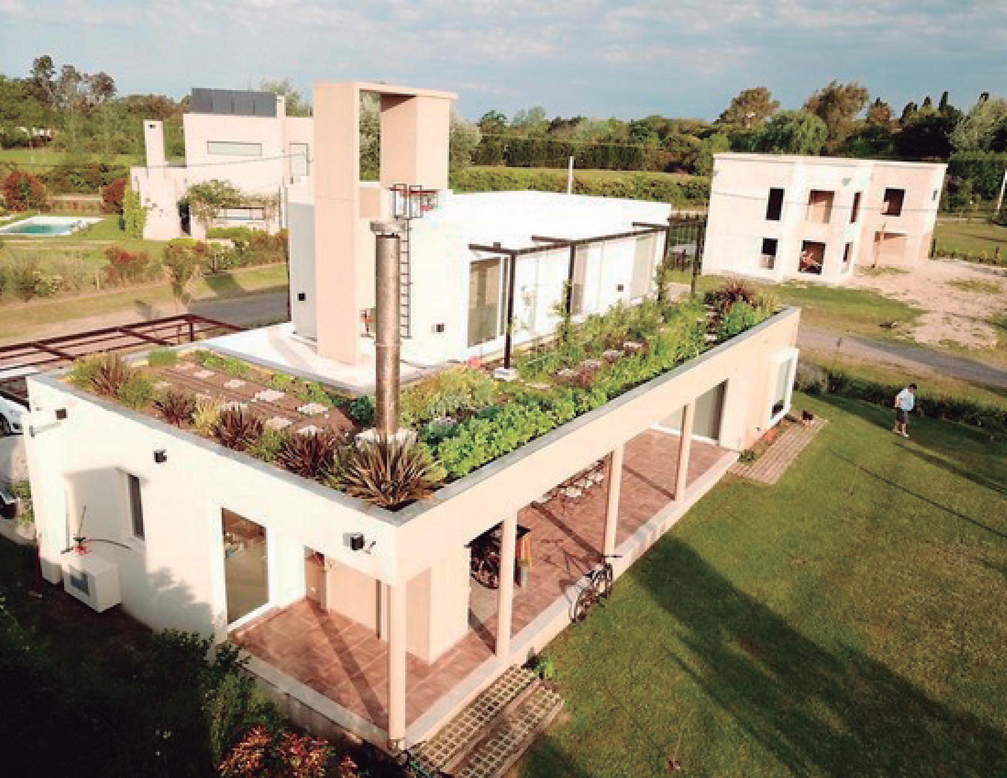 El techo verde se erigió en el tema y la razón de ser de la casa, en el cual la familia se encuentra, realizan tareas productivas y de relajación. Sirve como aislante térmico, tanto en verano como en invierno, y se complementó con lana de vidrio sobre cielorraso interior de placa de yeso para llegar a un nivel de eficiencia “A” de invierno y “B” en verano. También atiende a los intereses de los clientes el hecho de ser un lugar de hospedaje de biodiversidad, y sobre el tema han trabajado posteriormente.