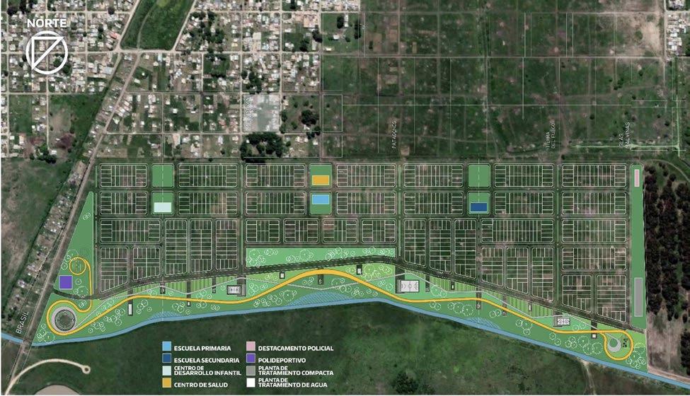 185 mil metros cuadros destinados a Espacios Verdes. De los cuales 134 mil corresponden a la generación de un gran parque lineal, incluyendo sus accesos, equipamientos y forestación. Diversos equipamientos comunitarios, incluyendo espacios educativos de los tres niveles (inicial, primario y secundario), de salud, seguridad e integración comunitaria. Dentro del parque, se incluyen incluye tres Salones de Usos Múltiples de la Comunidad y tres playones deportivos.