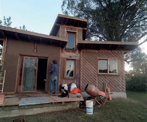 medida, fabricados en la misma zona, con tierra arcillosa y aserrín de descarte de los aserraderos locales. Estos adobes se cortaron y secaron durante el verano, para estar disponibles en invierno, minimizando los procesos húmedos de la obra. El mortero se realizó con arcilla del propio terreno, previamente analizada, utilizada en imprimaciones y revoques, con fibra local de rastrojo de centeno y avena. Para las terminaciones se emplearon diversas técnicas, dependiendo de la exposición que tuvieran: en las habitaciones, se priorizó la buena refracción de la luz mediante una pintura natural en base a arcilla blanca, cuarzo y engrudo; en áreas expuestas a la salpicadura directa de agua (erosión hídrica y mucha humedad ambiente), como la ducha y lavamanos, se utilizó estuco tradicional a la cal; y en la cocina, se aplicó un trabadillo (estuco de yeso, cal y árido), ajustado tras pruebas de color con la luz ambiental. De este modo, se aseguró la protección de las paredes sin perder su transmisión de humedad tan necesaria. Para el exterior, sobre la aislación de lana de oveja, se alternaron revestimientos de barro y madera flameada (ciprés carbonizado). En lugares donde el diseño volumétrico no incluye aleros ni zócalos, se empleó madera flameada, mientras que en áreas con dichos elementos, se utilizó revoque de tierra con una protección de barniz natural para preservar los colores y texturas autóctonas de la arcilla y la madera de la región. Este enfoque integral no sólo busca reducir la huella de carbono sino generar diseños y espacios confortables que demanden la menor cantidad de energía durante su uso, así como también resaltar la relación con el entorno natural de la Patagonia.