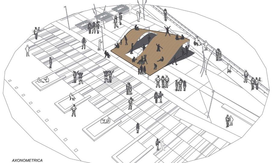 de las imágenes, permiten delimitar un lugar posible de ser cerrado para actividades de información o consultas. La cubierta de este lugar es de lona acrílica similar al usado en las carpas de playa. La idea es que este sitio permanezca abierto, formando parte de la acción expositora.