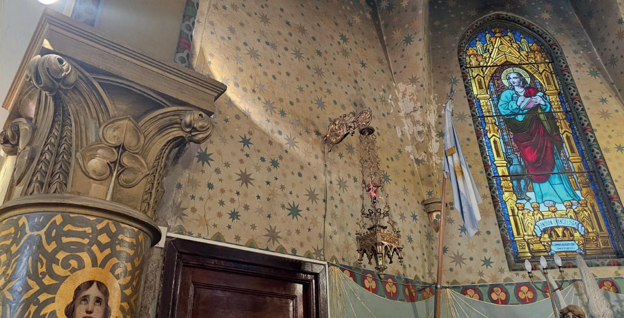 La parroquia Nuestra Señora de Lujan continúa maravillando con arquitectura neogótica, sus vitrales y su espectacular cielorraso de bronce estampado, a pesar de que necesita fuertes reparaciones.