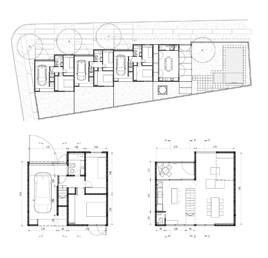 Operando en un lote alargado, en esquina y de forma trapezoidal, se proyectaron tres unidades idénticas, como volúmenes apareados, que si bien cuentan con patios privados, servicios y accesos independientes, conforman un conjunto urbano continuo. Se aprovechó la irregularidad del lote para desfasar los volúmenes, y mediante esta operación, darle movimiento, independencia y privacidad a cada unidad