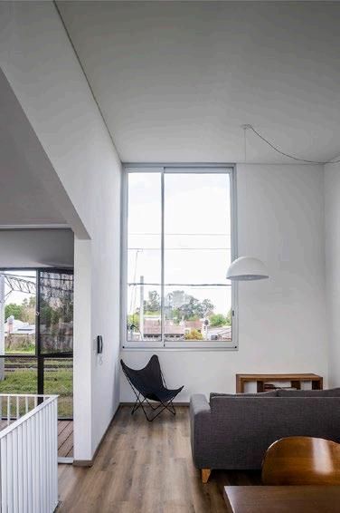 miento de viviendas individuales, que en vez de sumarse una al lado de otra, se multiplican en un conjunto que entiende la ciudad y lo colectivo, valorando la esquina y sus veredas. Poniendo el mismo énfasis en lo urbano como en el interior, aportando calidad de espacio público al barrio, a pesar de la mínima expresión. La resolución espacial para individualizar y a la vez unir surge de las propias condiciones del lote. Una parcela en esquina de 8 x 32 metros permite generar cuatro unidades del mismo tamaño, con proporción de cuadrado perfecto, reforzando la idea de parte y conjunto. Los espacios sociales de la vivienda están en planta baja. A pesar de la restringida superficie, se intenta recrear las condiciones de espacios típicos del ideario criollo de casa. De esa manera, el quincho, la parrilla, el jardín con las plantas, el garaje, el patio para colgar la ropa, el galpón, el acceso, el estar y la cocina se repiensan en un espacio único, continuo, donde pequeños equipamientos resuelven lo específico y las relaciones en corte insinúan su ubicación. Para poder expandir las funciones públicas de la casa, se trató de utilizar la cantidad mínima de muros, articulando mediante carpinterías en la totalidad del plano, permitiendo flexibilidad. La planta alta contiene las actividades privadas y hace de lleno que cubre y techa el vacío completo de la planta baja social. Este juego es tanto interior como exterior. Donde no ocupa espacio exterior, en planta baja aparece la vegetación o las actividades