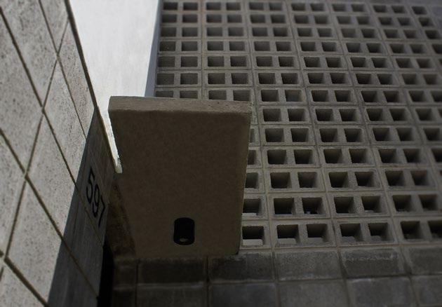 La vereda es reinterpretada del mismo modo que la vivienda, generando un jardín de uso compartido con la ciudad, utilizando un mismo lenguaje, material, vegetación y espíritu que el interior del conjunto.
