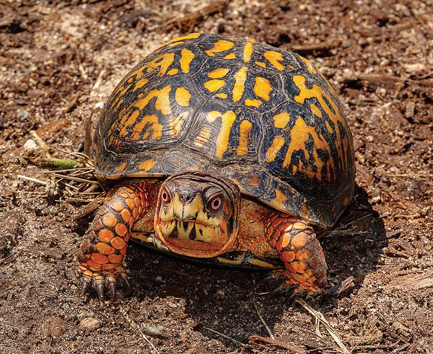 Eastern Box Turtles are very pretty. Just like with humans, each individual is unique. Some have red spots, some have orange streaks, some even have a yellow pattern on their shell. They all have four toes on each foot. This helps them move around on the forest floor and look for food.