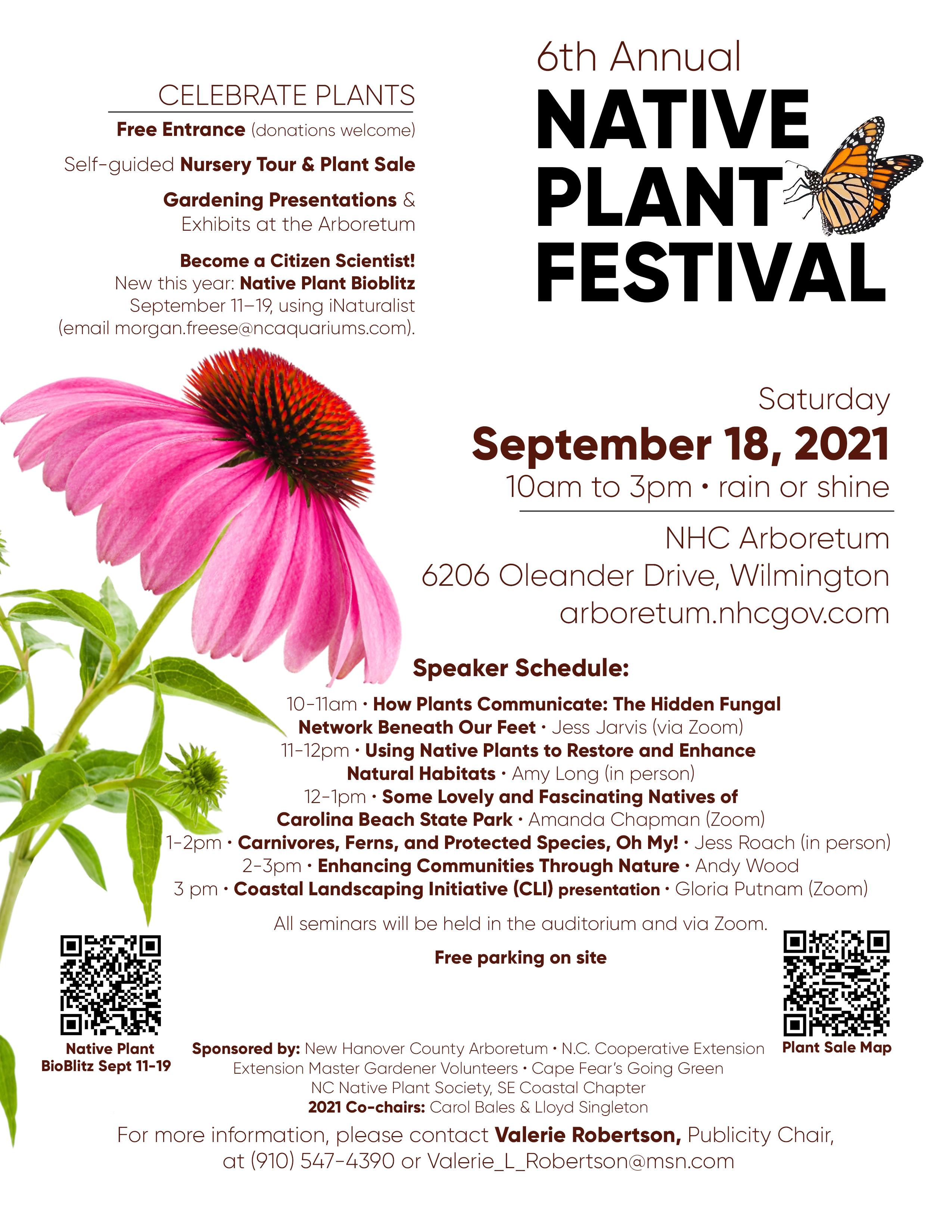The Native Plant Festival is organized by the Native Plant Alliance and sponsored by: New Hanover County Arboretum, NC Cooperative Extension, Extension Master Gardener Volunteers, Southeast Coastal Chapter of NC Native Plant Society, and Cape Fear’s Going Green. This year’s Festival co-chairs are Carol Bales and Lloyd Singleton.