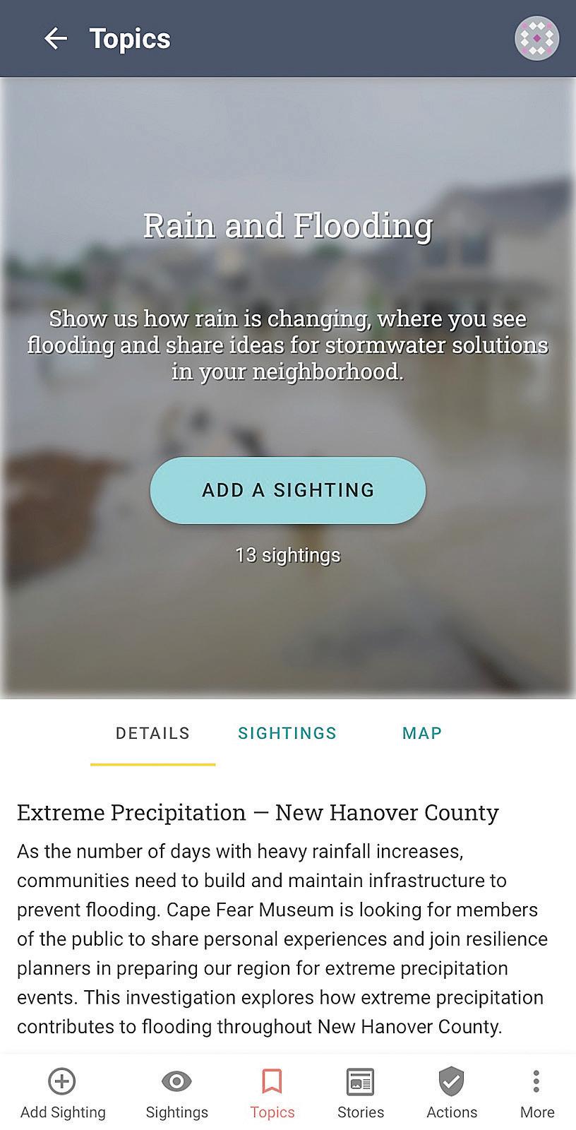 source: ISeeChange app This screenshot from the ISeeChange app shows information on its “Rain and Flooding” topic area, where you can add a sighting from your own area.