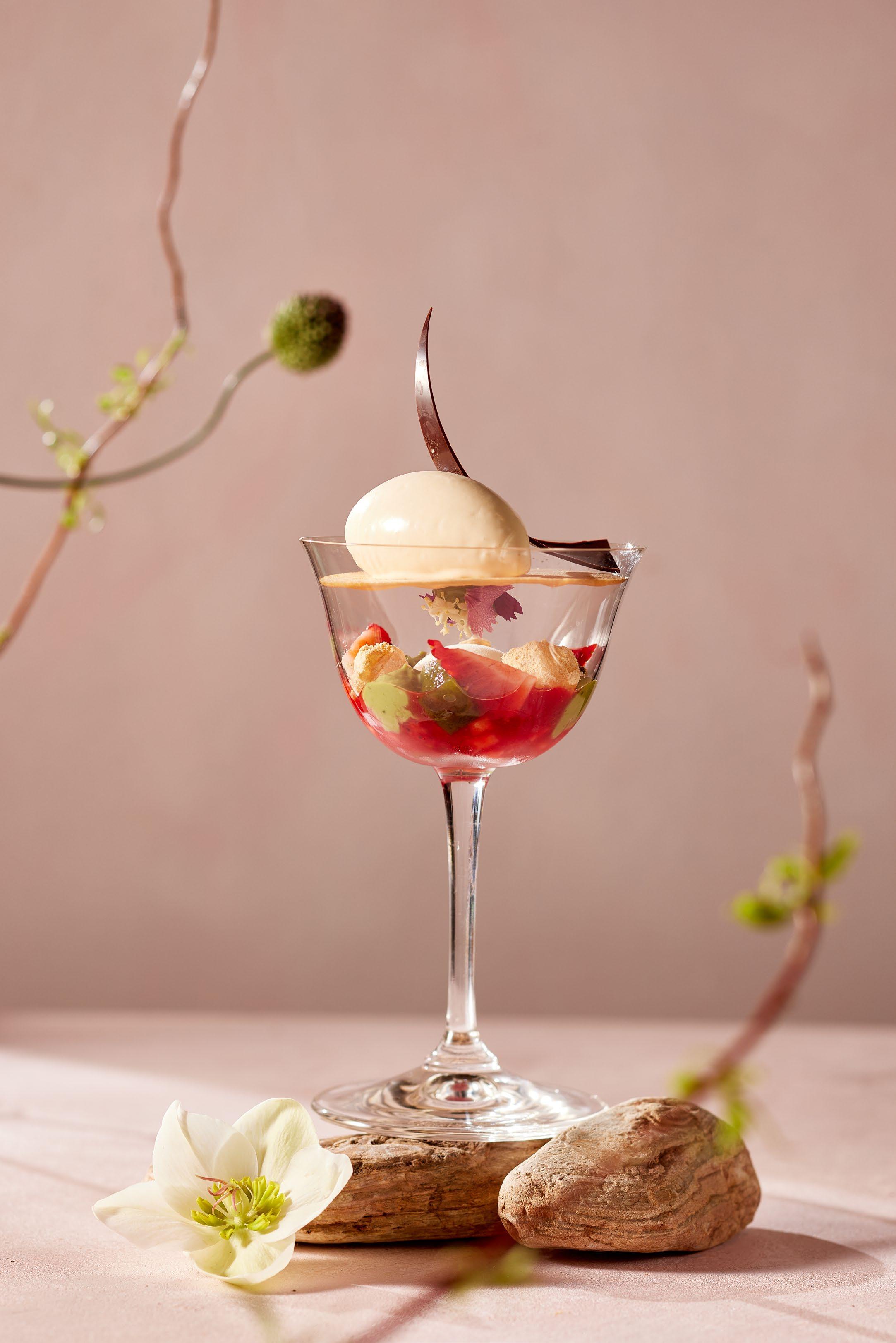 苺と抹茶のパフェ 苺、抹茶ゼリー、ヨーグルト、蜂蜜アイスクリーム