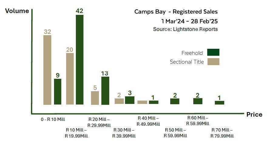 With over 100 sectional title schem es (incl m ini PUDs),com prising 916 sectional title units in Cam ps Bay/Bakoven,60 sales transactions (excl inter-fam ily transfers) were registered at the deeds office during the 24/25 financial year,with prices ranging from R2 4 - R45 m illion 72%of all transfers were below the R15 m illion m ark