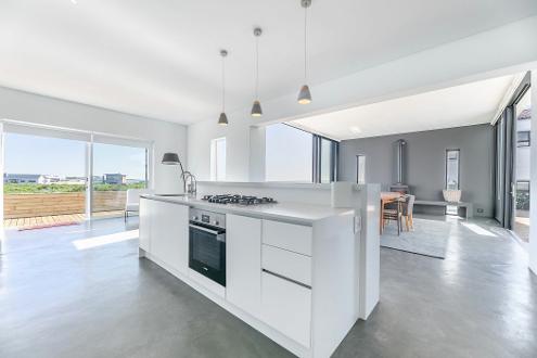 Chic and m inim alistic this stylish hom e breathes tranquillity and boasts glorious views The open-plan designer kitchen presents m odern white finishes.The upstairs balcony boasts sweeping views of the fynbos and unique West Coast sunsets.