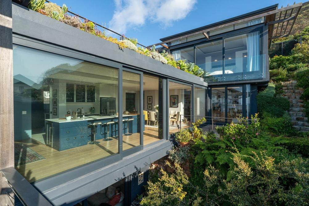 This unique m odern hom e,set high against a m ountain backdrop in Kalk Bay,boasts panoram ic ocean vistas across False Bay to Sim ons Town and on to Cape Point.