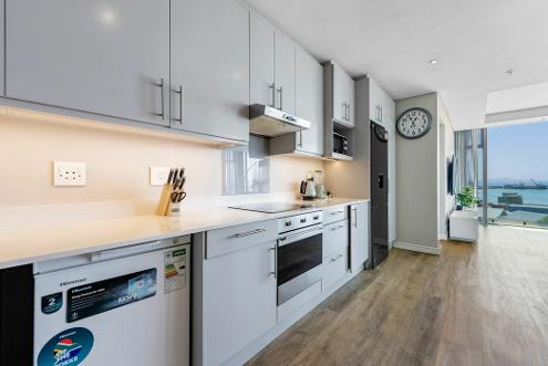 This m odern apartm ent is located in the heart of Bloubergstrand Village,offering 24-hour m anned security,CCTV,and electric fencing within walking distance to Kleinbaai Beach,popular restaurants,and on the MyCiTi bus route to Cape Town.