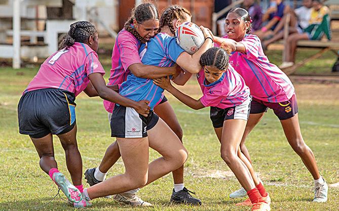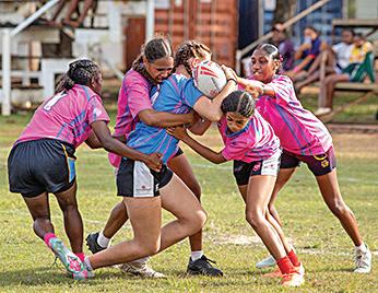 Caitlin McAllister takes on a four-on-one tackle from Elsie Daniel-Elia, Grethel Mairu, Teeahne-Rae Masso and Alvina Motton. Photo: Alex Rethus Photography.