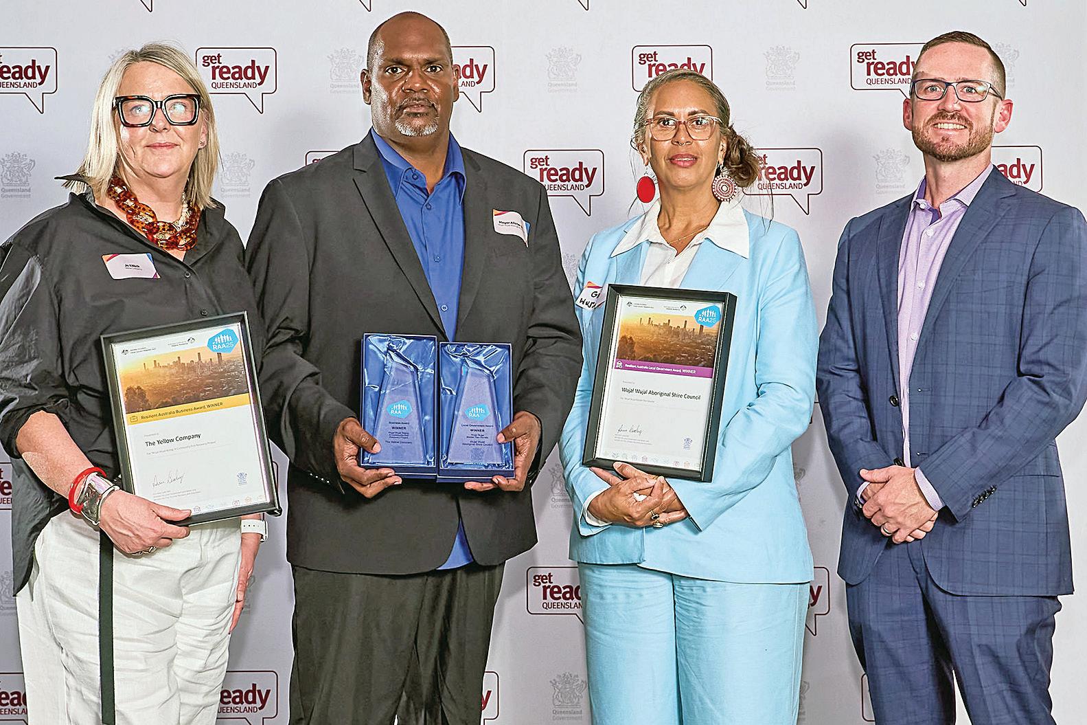 The Yellow Company director Jo Killick, Wujal Wujal Aboriginal Shire Council Mayor Alister Gibson, aged care co-ordinator Gina Manai and The Yellow Company managing director Ben Norling celebrate the community’s success at the Queensland Resilient Australia Awards on 28 August. Photo: Queensland Reconstruction Authority.