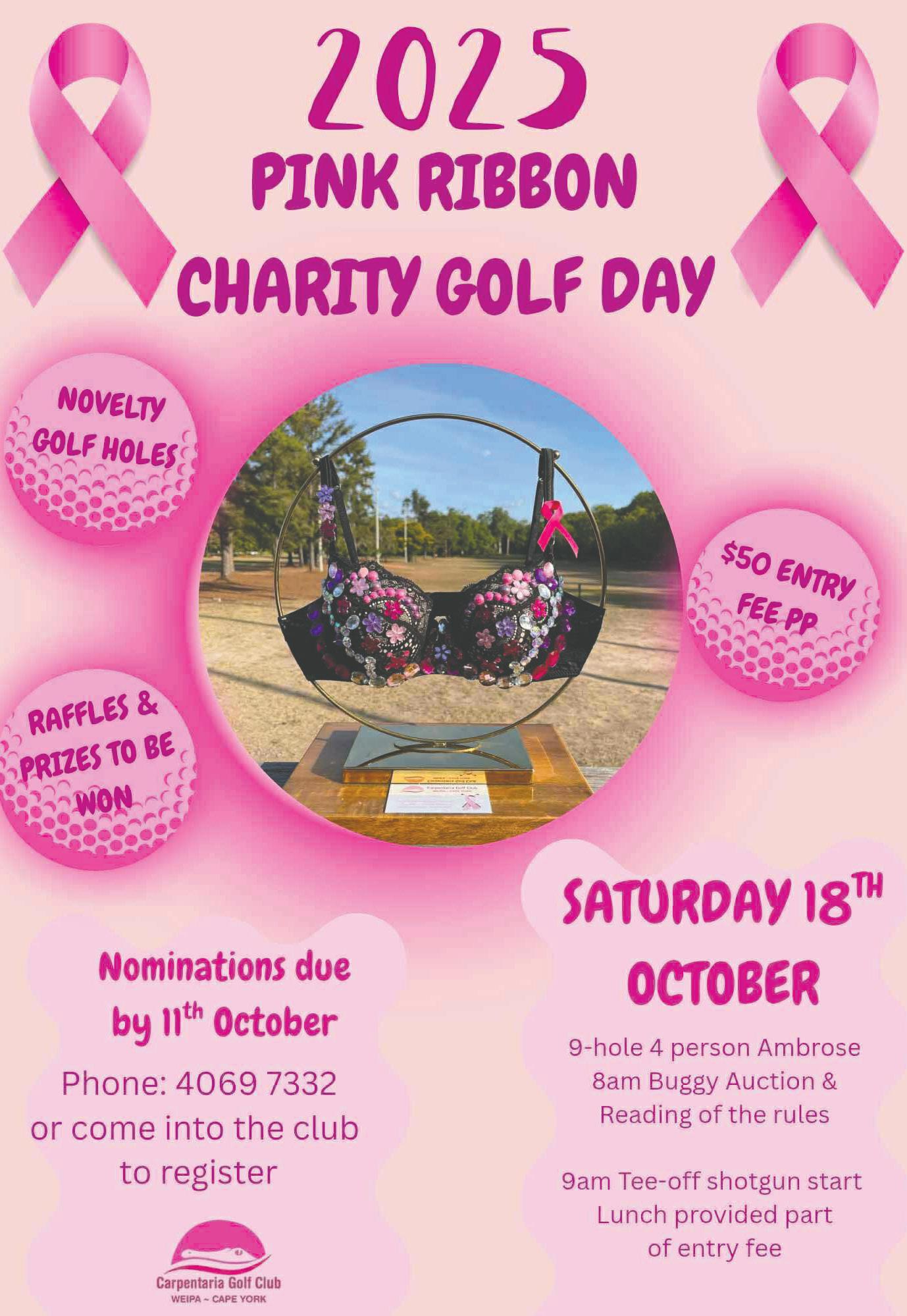 THE greens at Carpentaria Golf Club are set to be flooded in pink when the Weipa community again takes to the course for the Pink Ribbon Charity Golf Day.