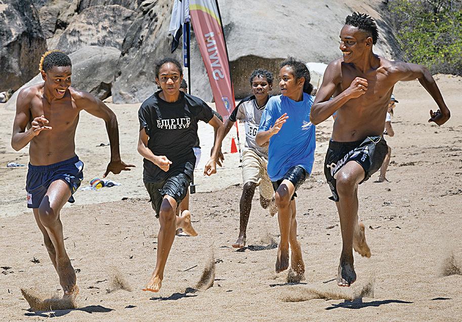 William and Jacob Mareko from Yam Island and Bamaga’s Pryce and Anthony Mara lead out Blake Wilson from Mornington Island in a hotly contested beach race during the annual NRL Cowboys House boarders outing. Photos: Supplied.