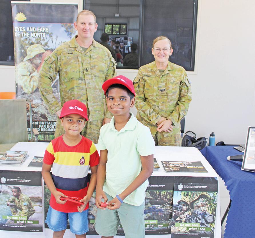 Talented footy players Masie Mosby and Rushon George with Jake O’Halloran, the AFL Cape York operations officer.